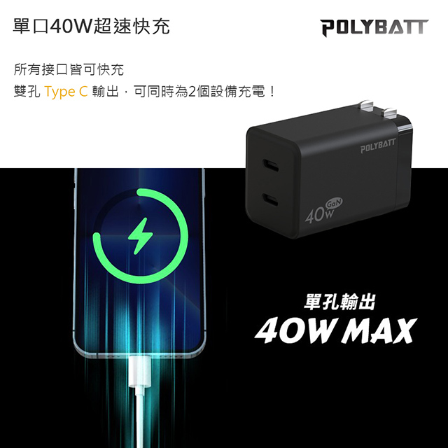 【Polybatt】40W氮化鎵GaN 雙孔PD極速充電器(雙PD旅充頭/雙孔Type-C)