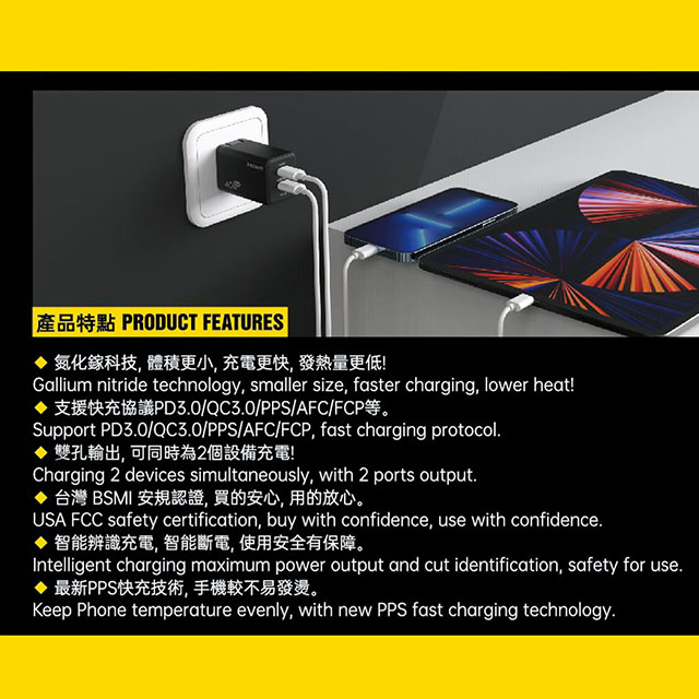 ◎ 使用「氮化鎵」科技,體積更小,充電快、發熱量低