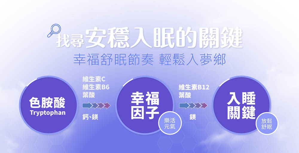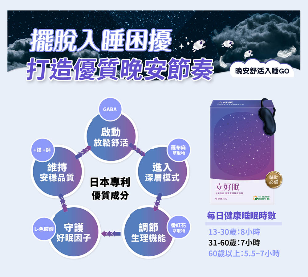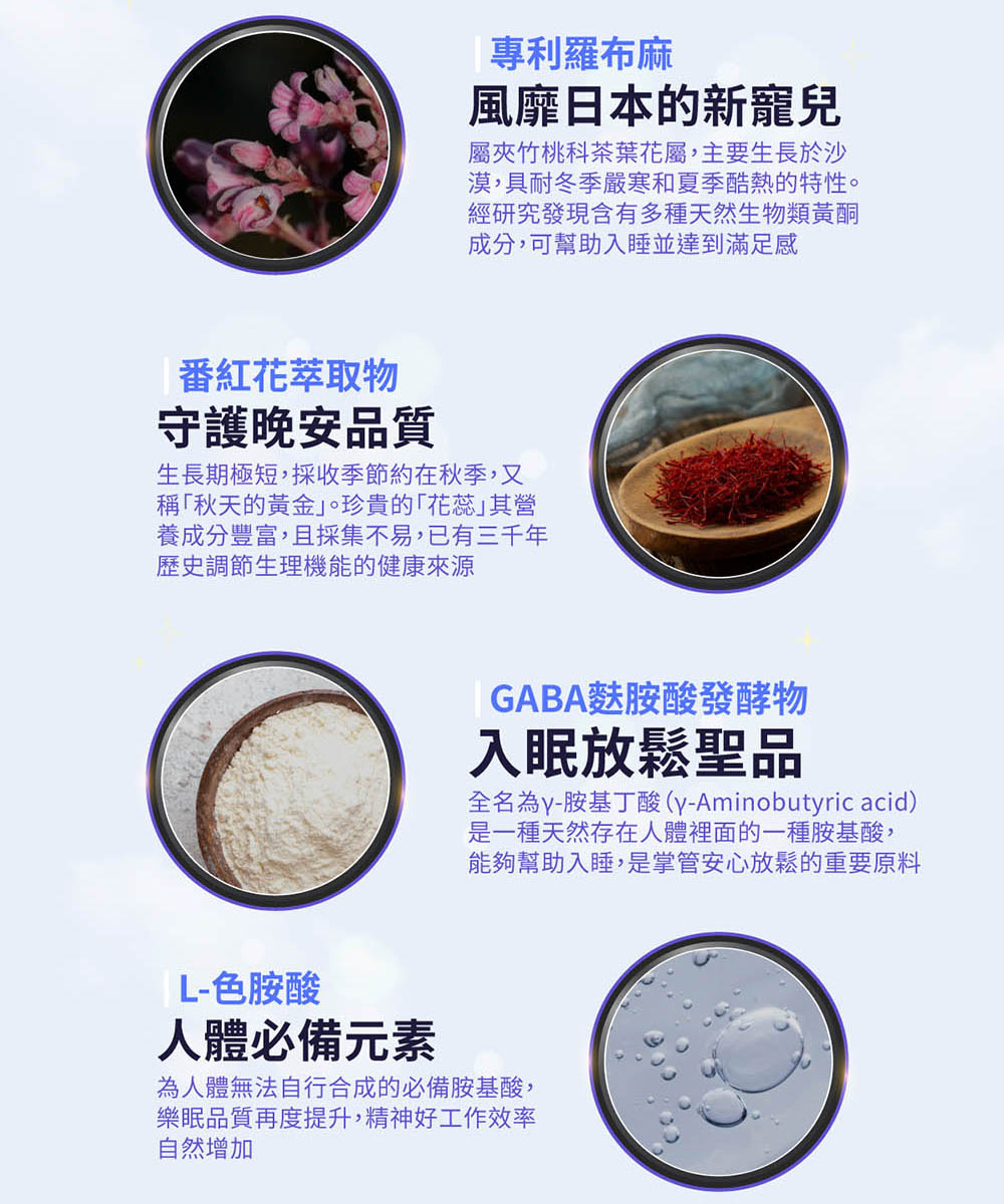 嚴選專利優質好眠成分 GABA麩胺酸發酵物x入眠放鬆聖品 專利羅布麻萃取物x天然生物類黃酮 番紅花萃取物x守護晚安品質