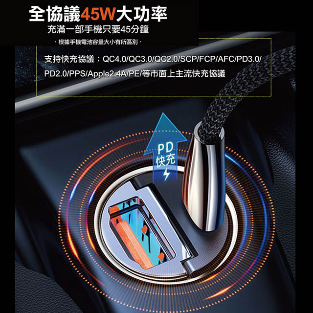 極速45W雙孔PD+QC迷你拉環快速車充+金屬編織PD快充線/傳輸線(2M)