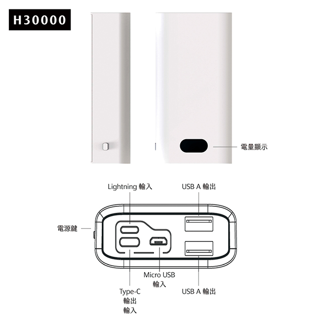【台灣製造】H30000液晶顯示 22W雙向/快充行動電源(三輸入、三輸出) 白色