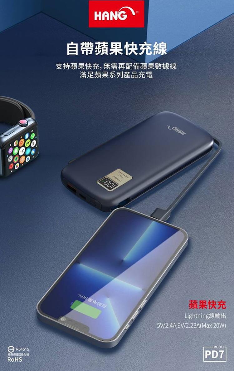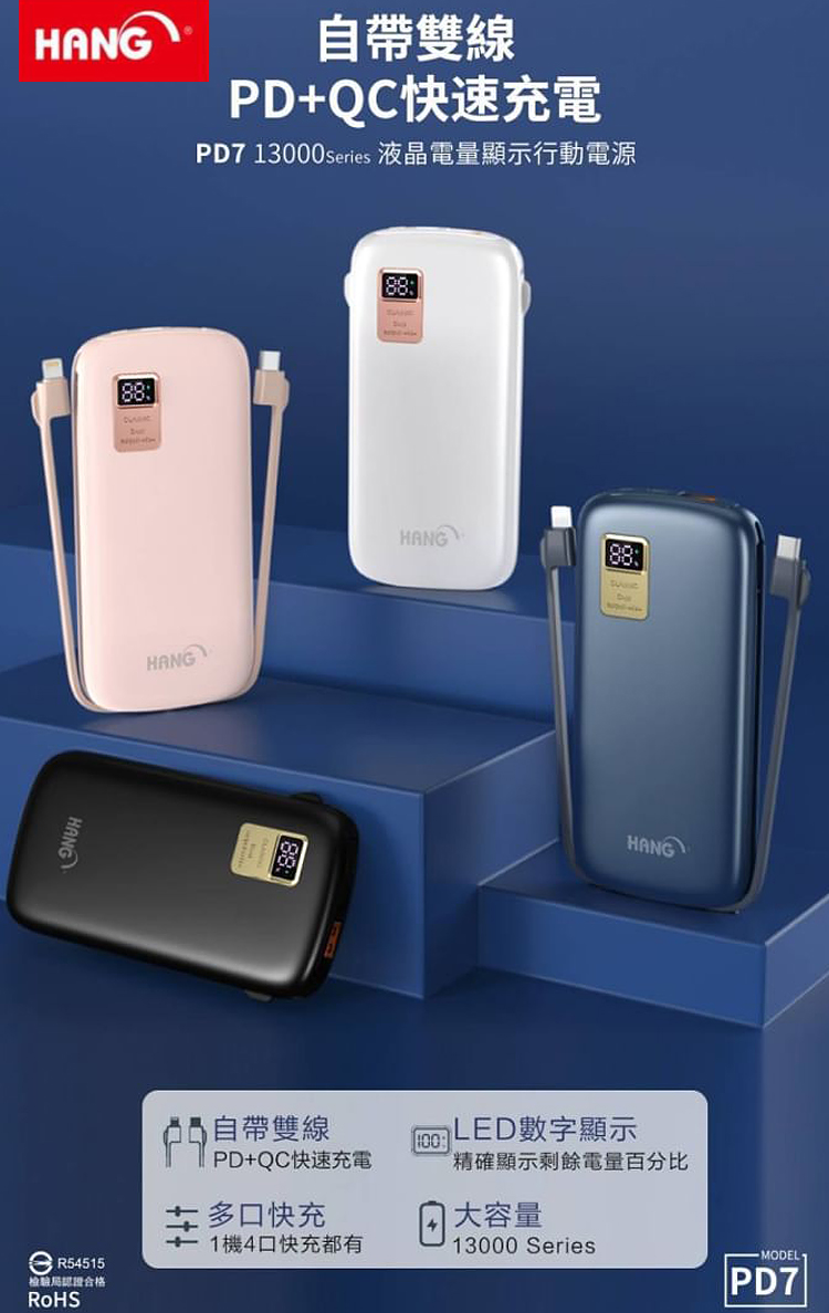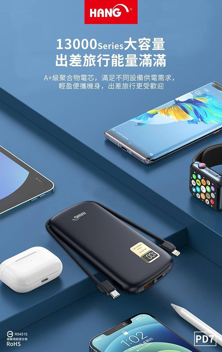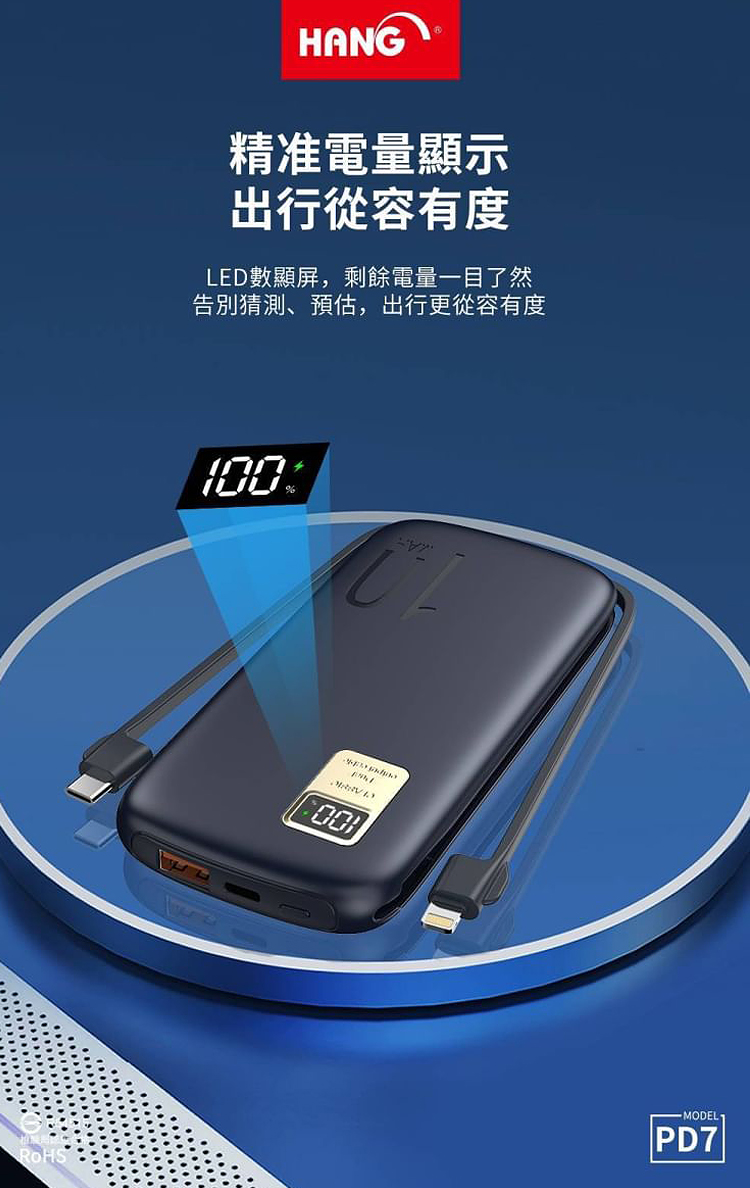 HANG 13000mAh 行動電源 PD7 行動電源自帶線二種接頭 支援/Type-C/Iphone