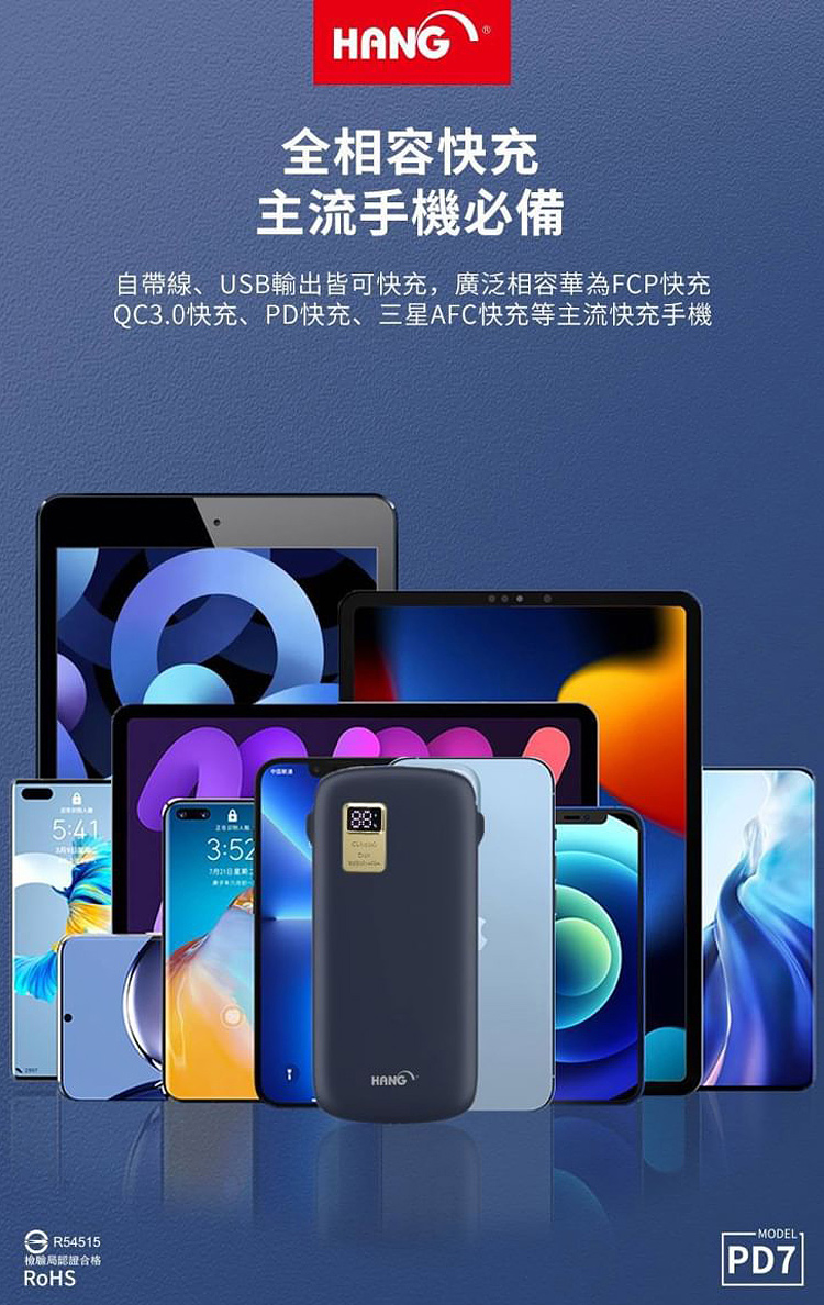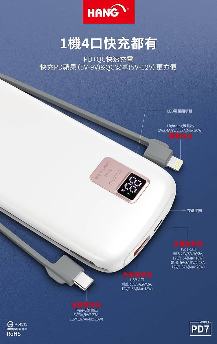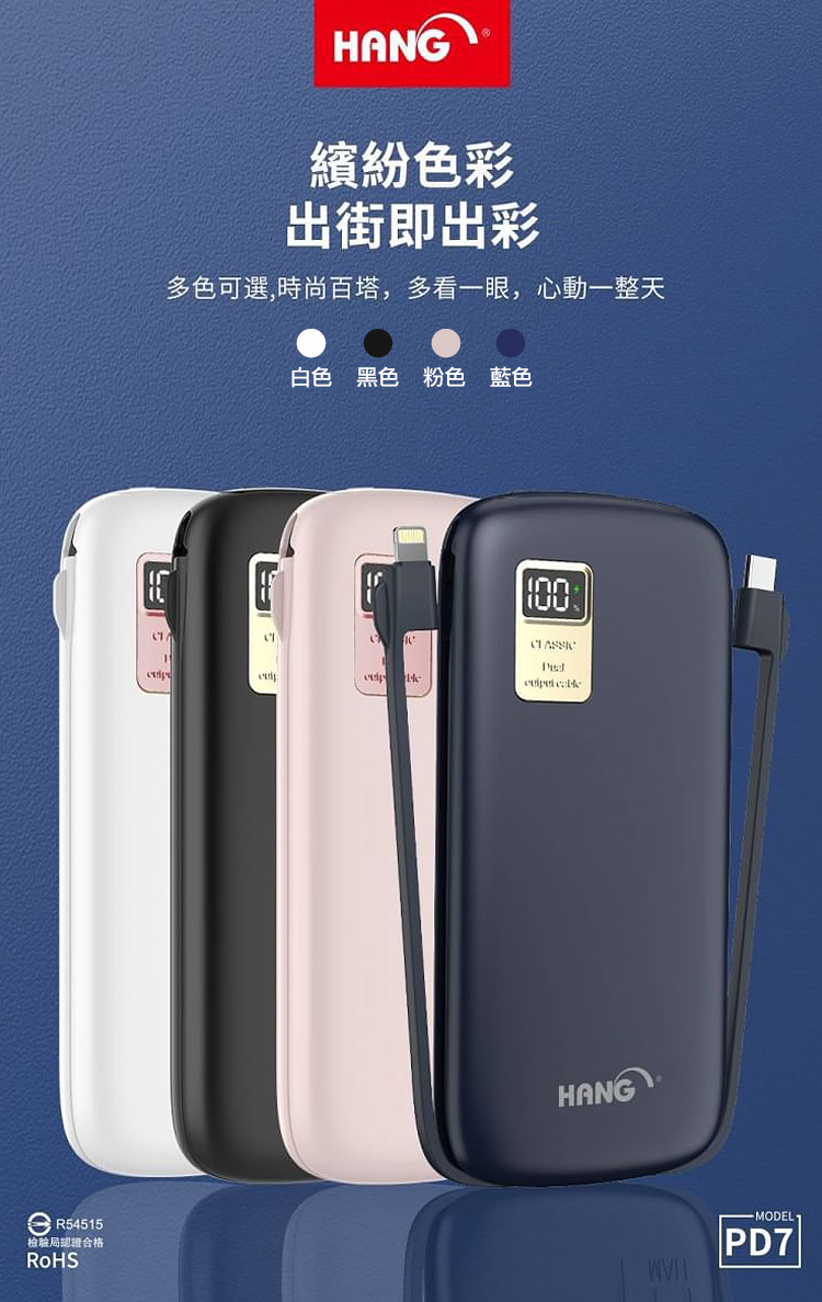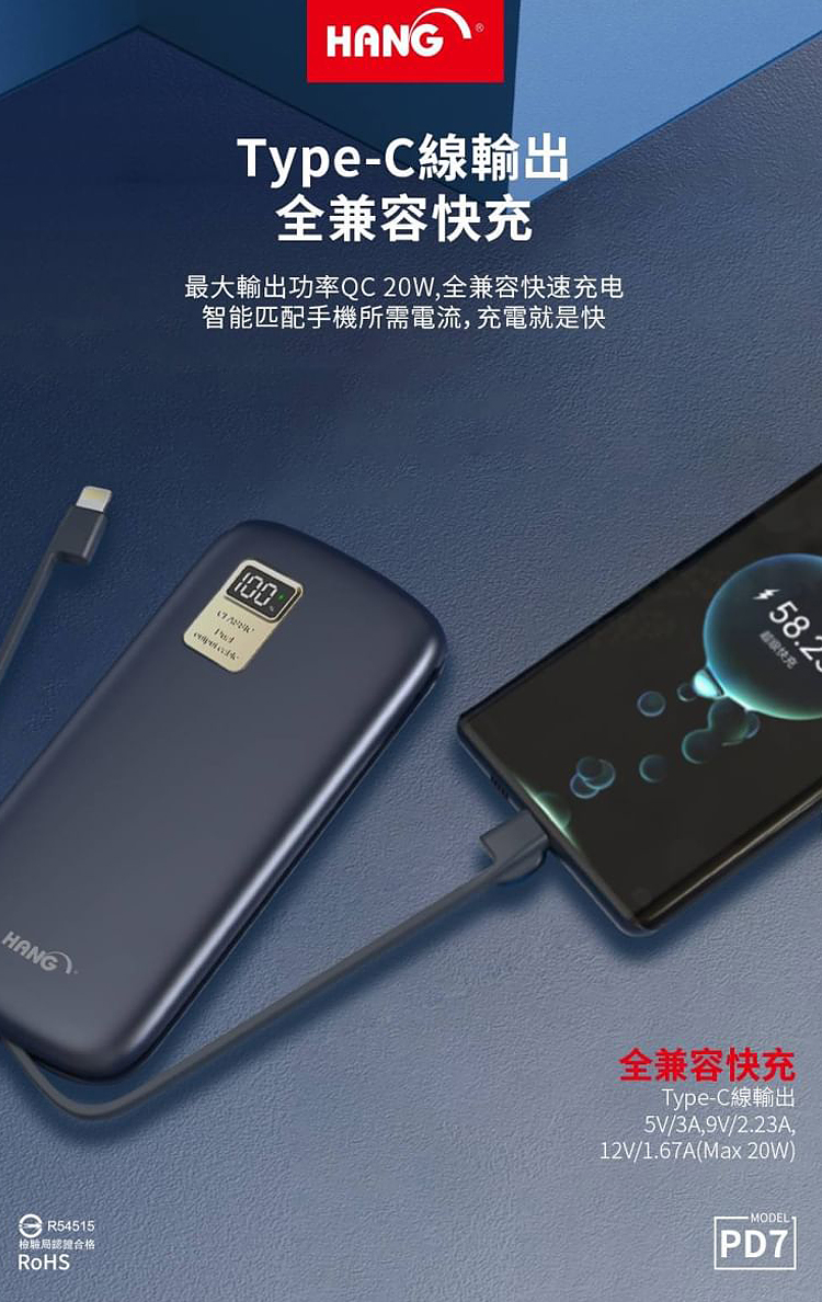 HANG 13000mAh 行動電源 PD7 行動電源自帶線二種接頭 支援/Type-C/Iphone
