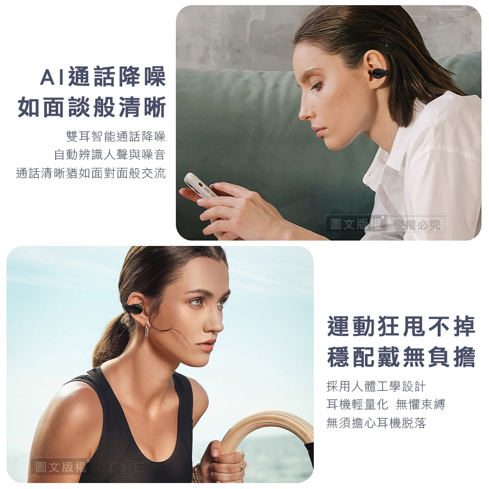 不入耳 舒適無感配戴 HiFi高音質,最真實的聽覺響宴 AI通話降噪,聲音清晰 最適合運動的藍牙耳機 無痛配戴,狂甩不掉