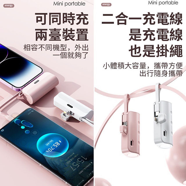 【自帶支架】5000mAh 直插式/口袋行動電源(三輸出、一輸入) 甜心粉