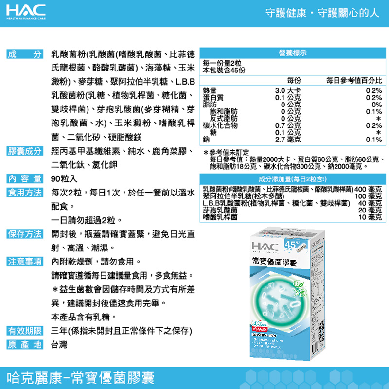 HAC-常寶優菌膠囊嚴選耐酸之芽孢型乳酸菌、嗜酸乳酸桿菌、酪乳酸桿菌、比菲德氏龍根菌、乳酸腸球菌、鏈球菌、糖化菌等八種優質益生菌(Probiotics),助其消化。