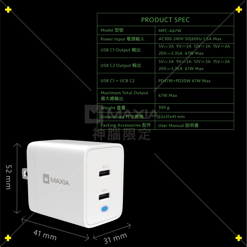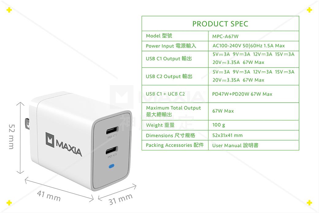 【MAXIA】氮化鎵GaN 67W雙孔USB-C充電器-白(MPC-A67W)