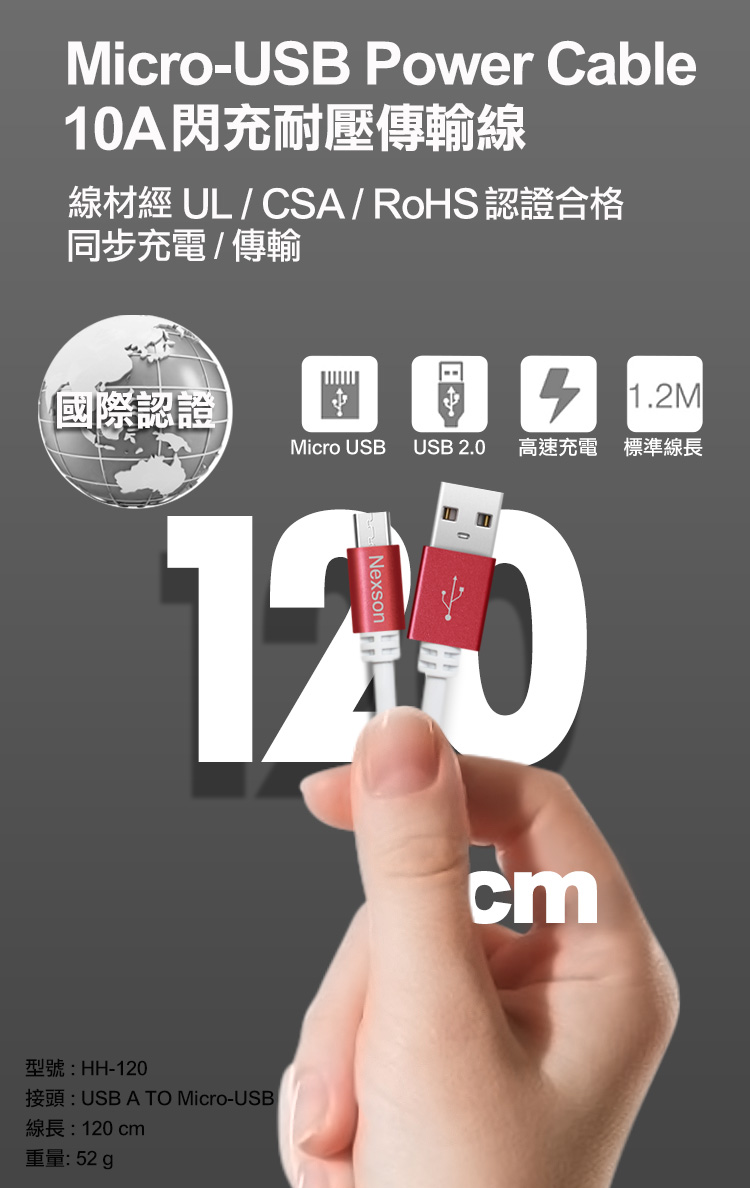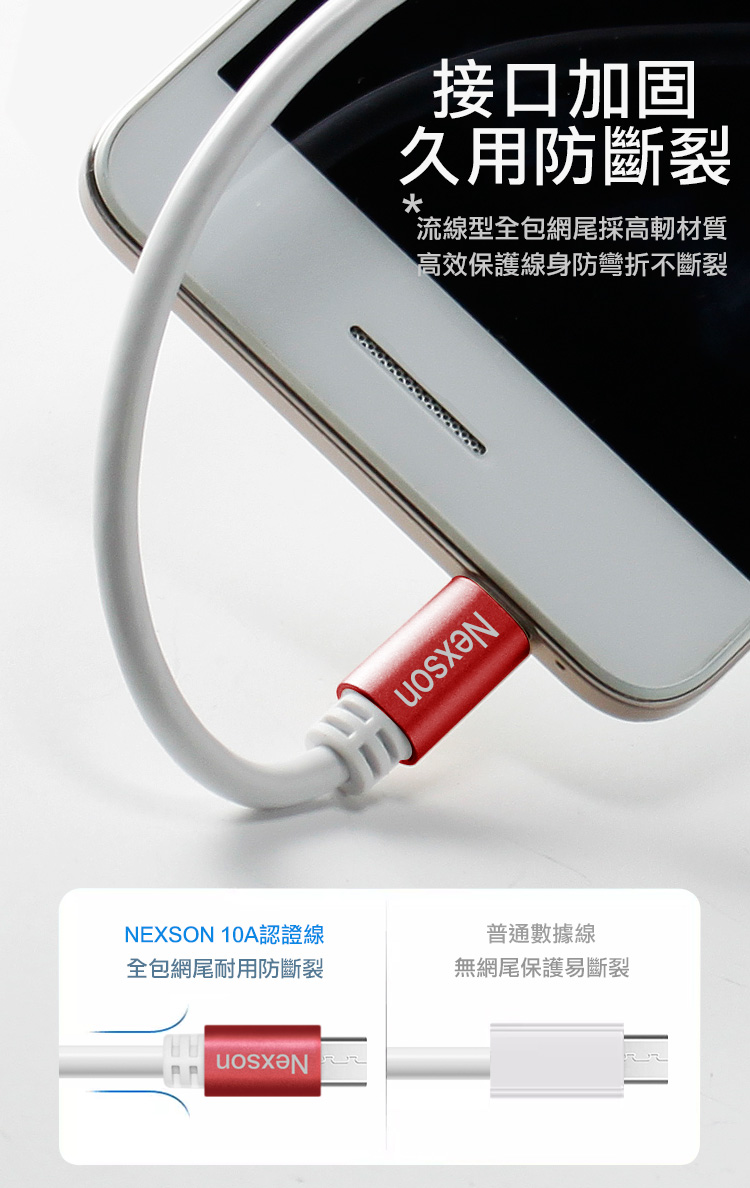 (2入) NEXSON 10A認證閃充MICRO USB傳輸充電線-紅色120cm