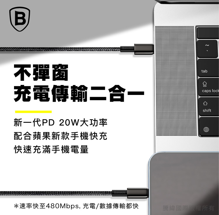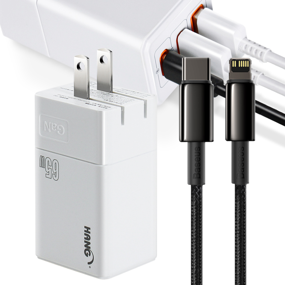 HANG 三代氮化鎵65W 白色+Baseus鎢金線Type-C to Lightning iphone/ipad充電線100cm