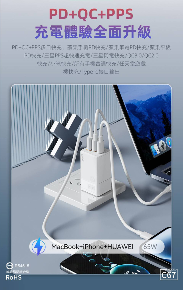 TYPEC1+(TYPEC2+USB-A)同時輸出:45W+15W