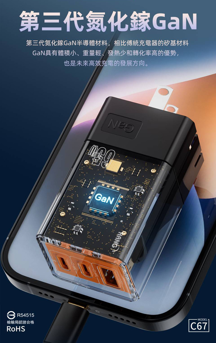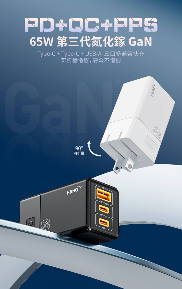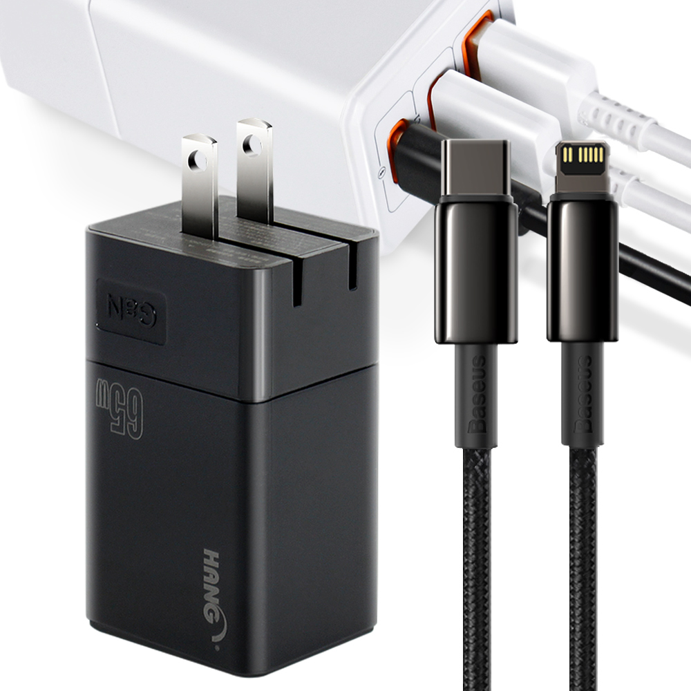 HANG 三代氮化鎵65W 黑色+Baseus鎢金線Type-C to Lightning iphone/ipad充電線200cm
