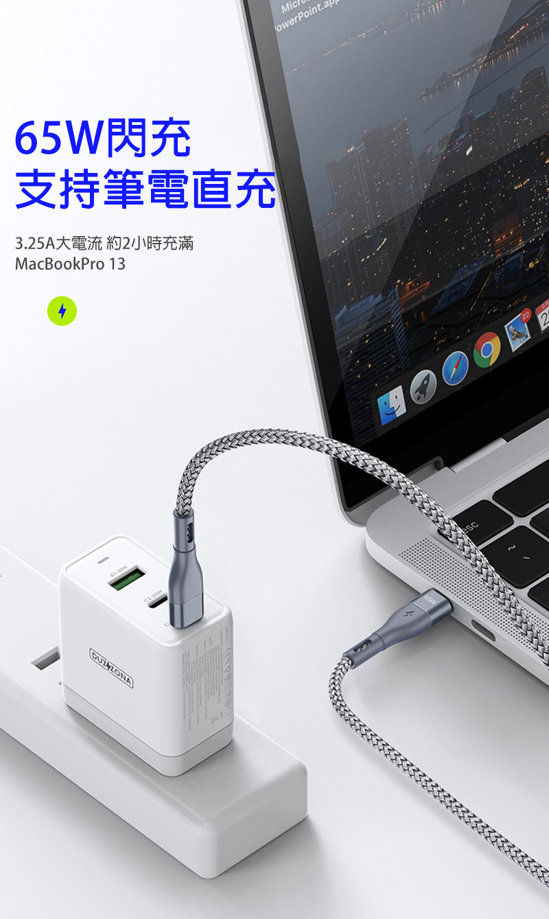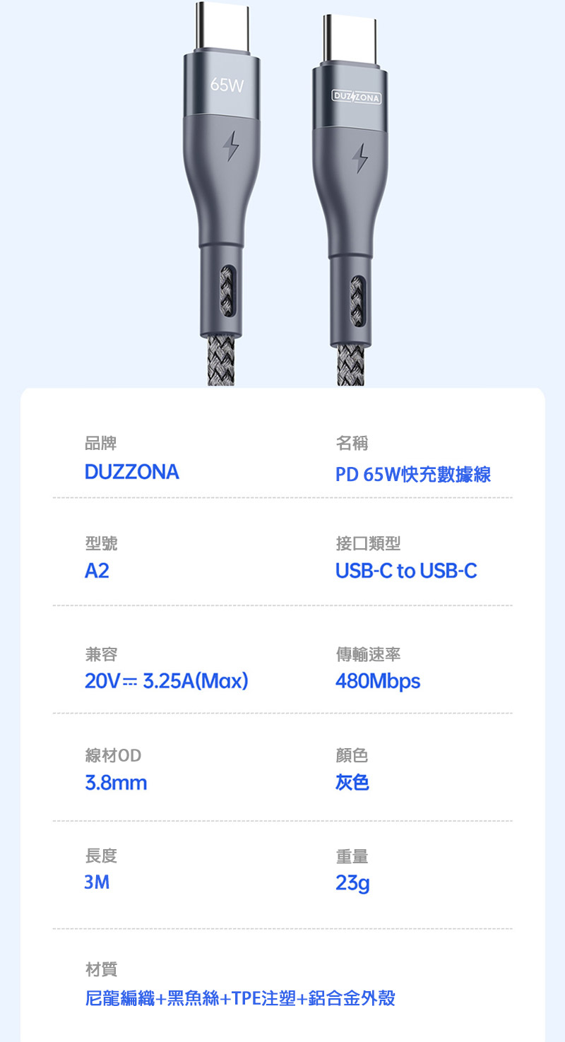 DUZZONA A2 Type-C to C 編織充電線(PD65W)(3M)