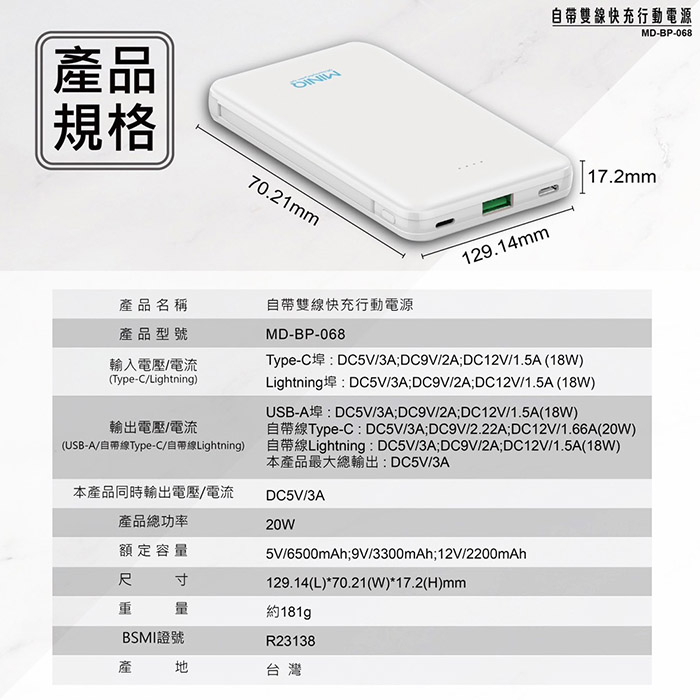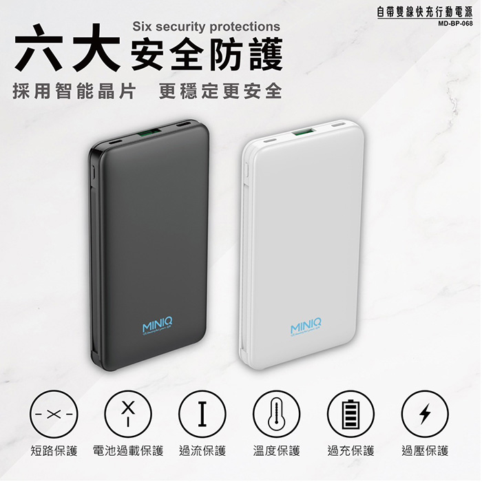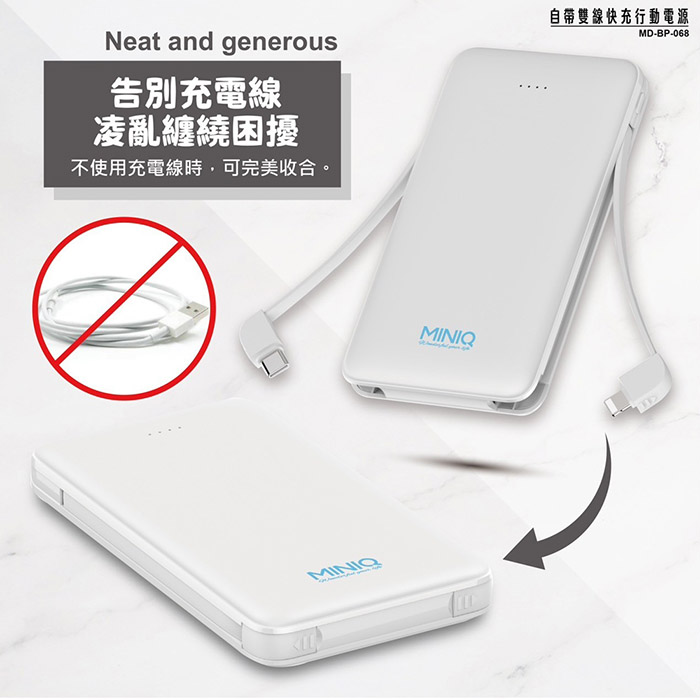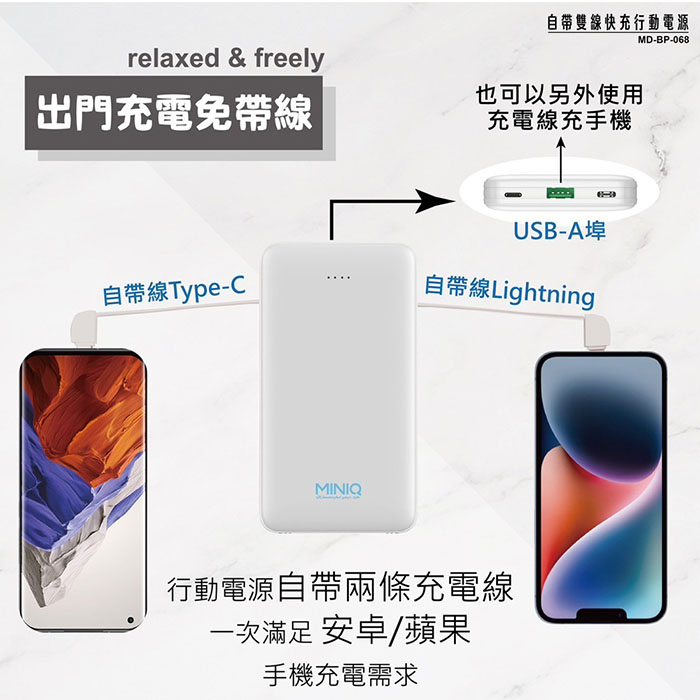 MINIQ大容量帶線快充行動電源MD-BP-068,