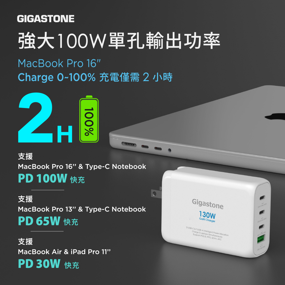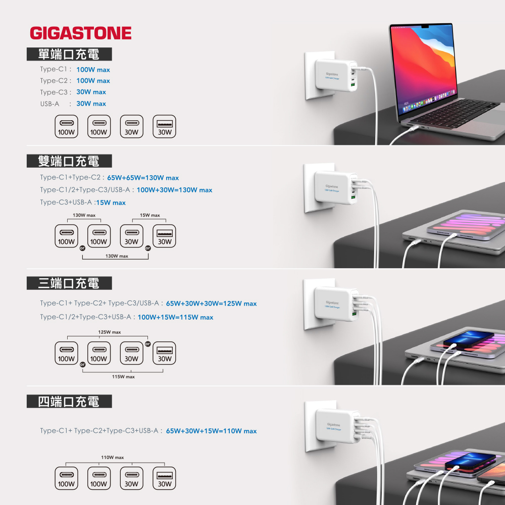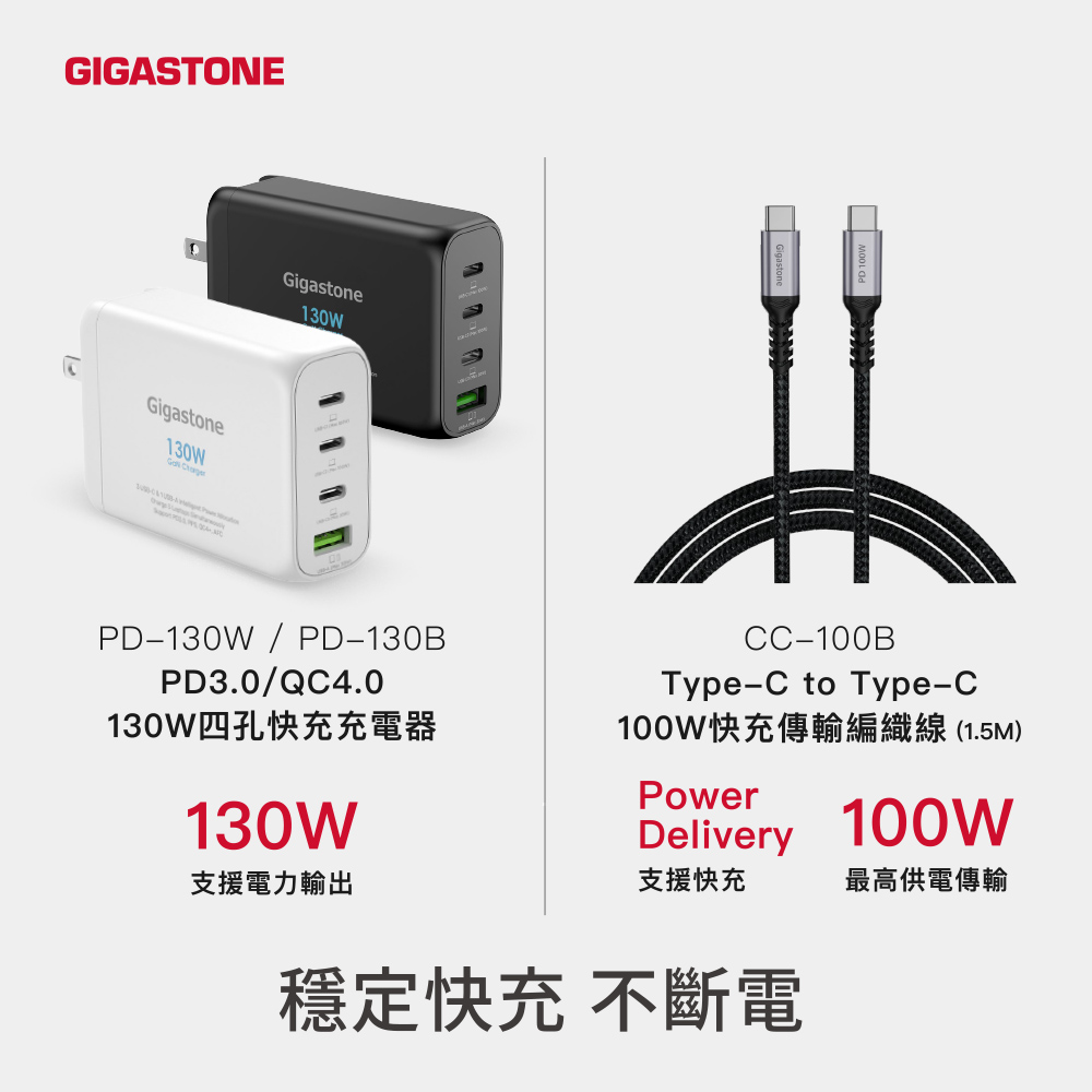 【Gigastone】130W GaN 氮化鎵四孔充電器 + C to C 100W快充傳輸線 快充組(PD-130)_黑色
