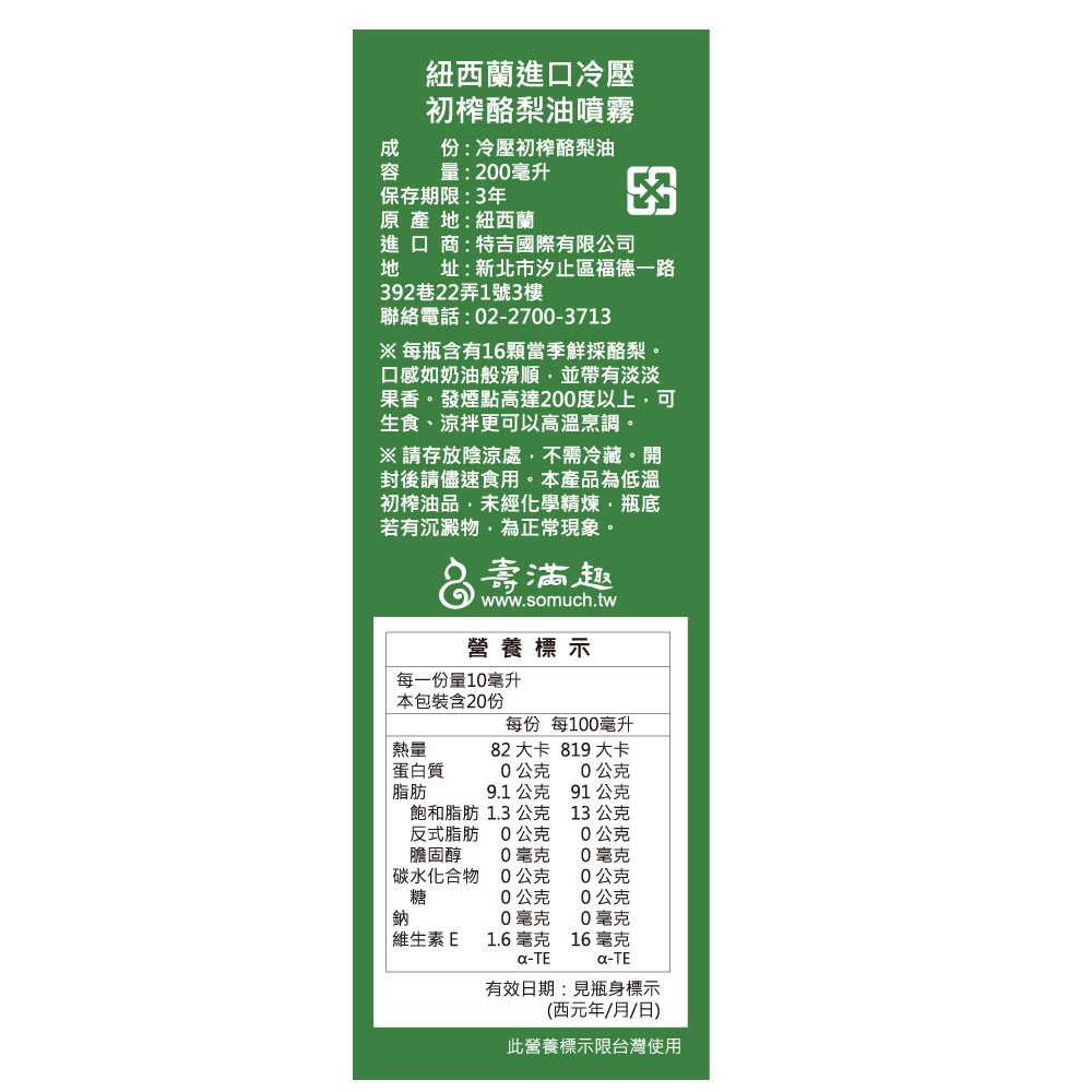 【壽滿趣-Somuch】頂級冷壓初榨酪梨油噴霧/噴油瓶(200mlx3)