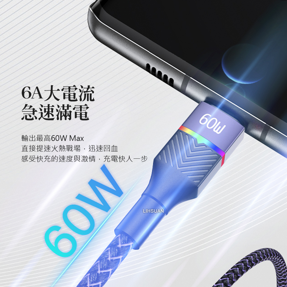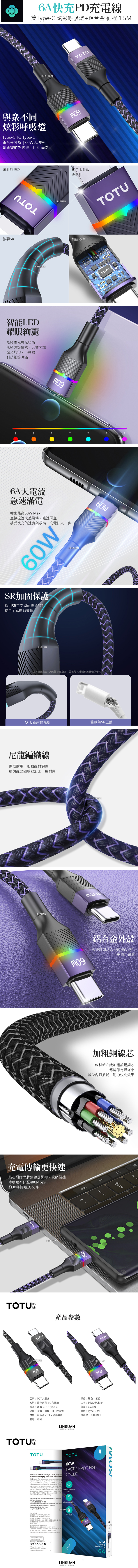 TOTU台灣官方 雙Type-C/PD充電線傳輸線閃充線編織快充線 LED 呼吸燈 征程系列 1.5M 紫色