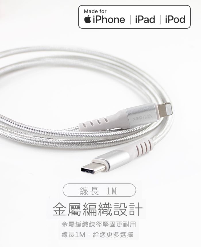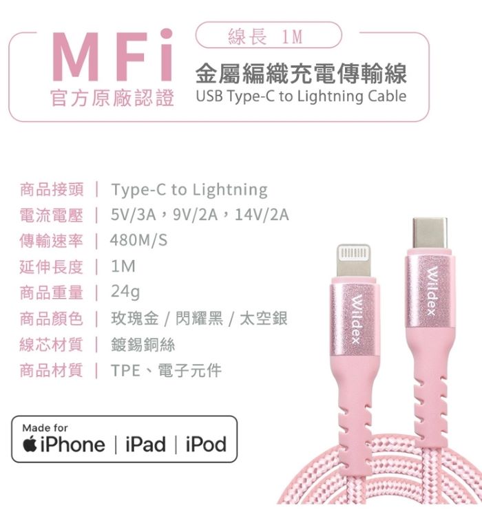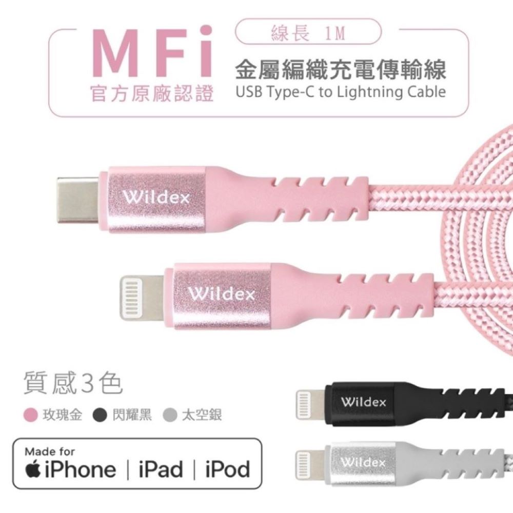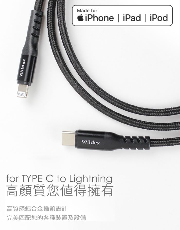 Wildex MFI蘋果認證編織線 TYPE C to Lightning-100cm-閃耀黑 WDFMI-1M-K