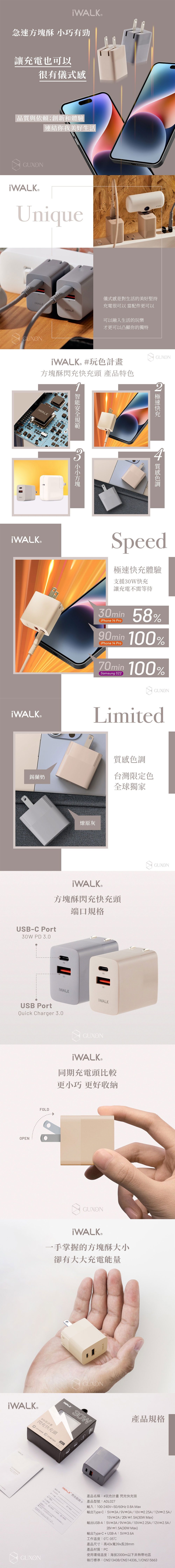 【iWALK】方塊酥 30W QC3.0+PD3.0 閃充快充頭-燎原灰
