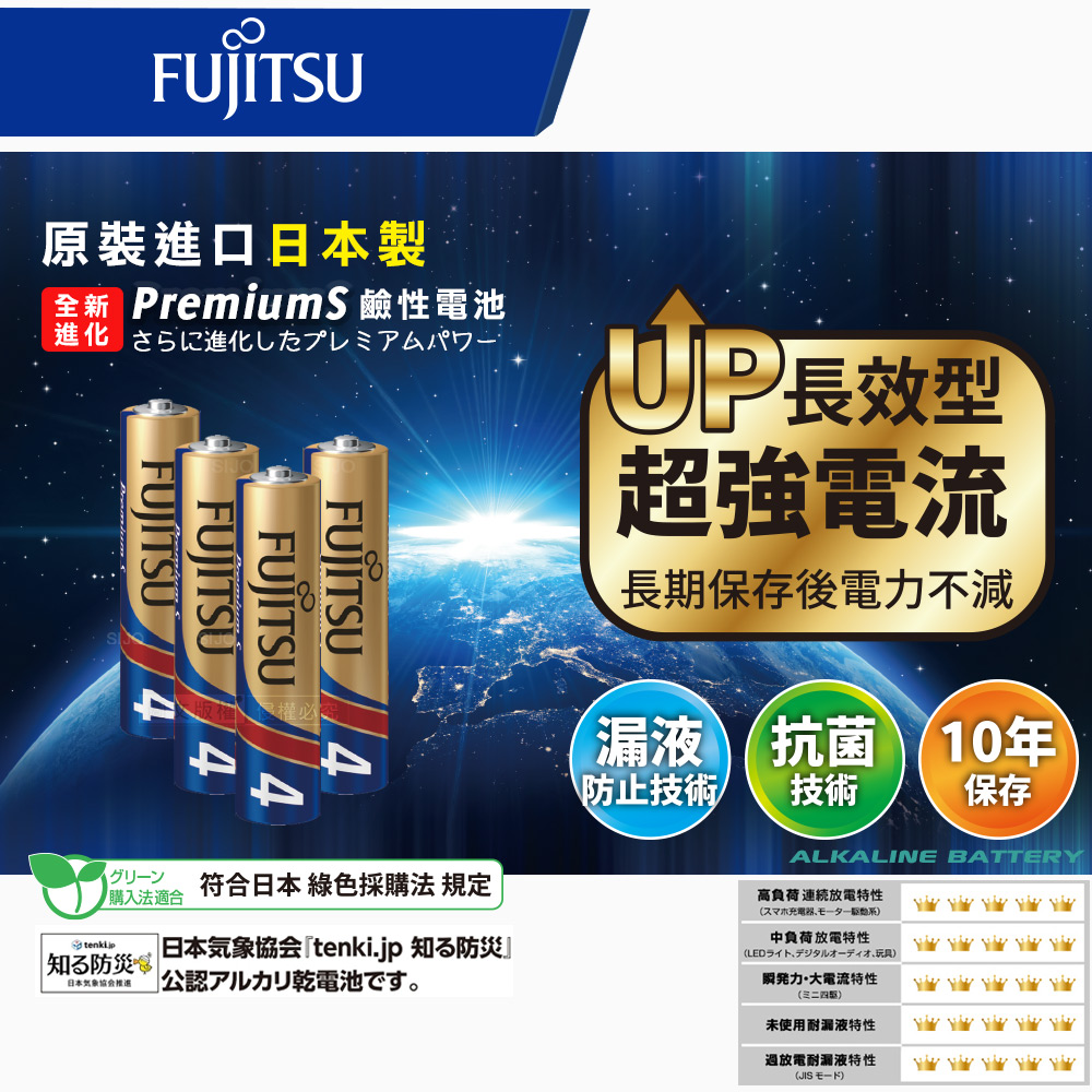 日本製 Fujitsu富士通 Premium S全新進化 4號AAA長效超強電流鹼性電池(精裝版8顆裝)