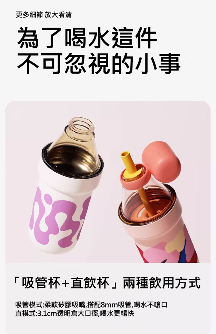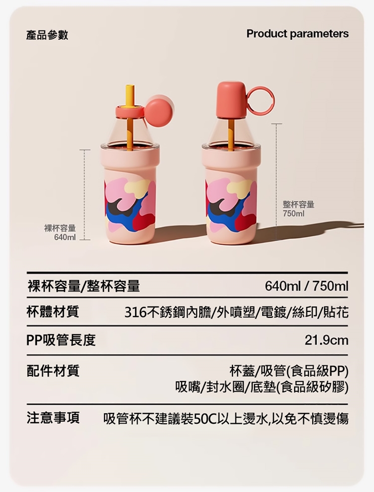 注意事項:杯子本身材質耐高溫可放開水,使用吸管喝燙水容易燙傷建議放50℃以下溫水,當裝入開水時請小心飲用。