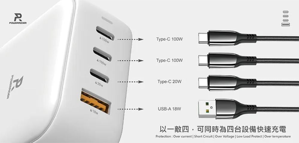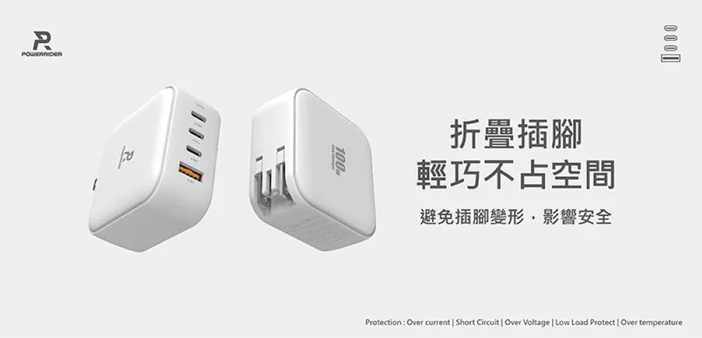 PowerRider 100W GaN氮化鎵4孔PD+QC折疊快速充電器-黑 PD-1002CA(K)