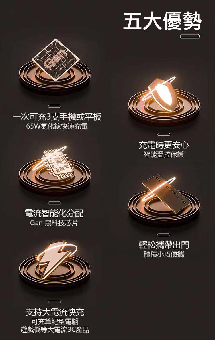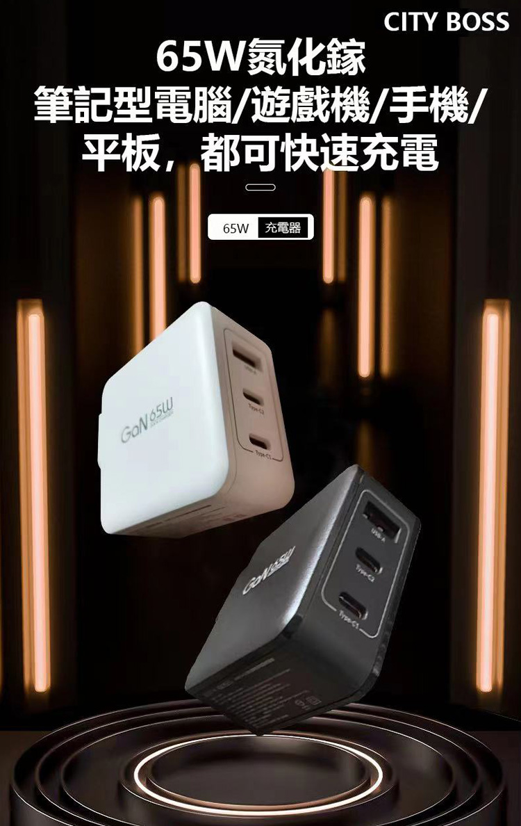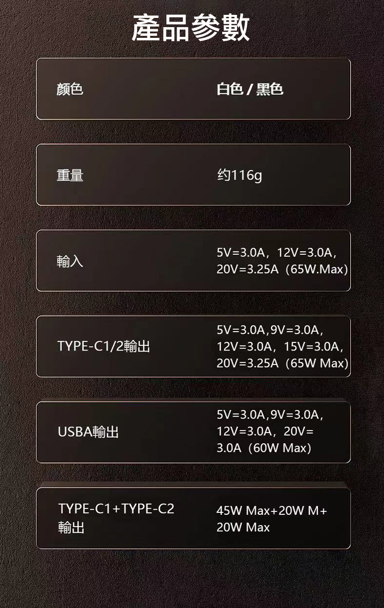 TYPEC1+(TYPEC2+USB-A)同時輸出:最大65W