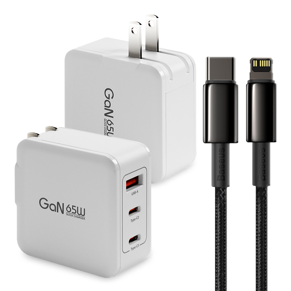 CB 65W GaN 氮化鎵 快速充電器-白+鎢金線Type-C to Lightning iphone/ipad充電線100cm