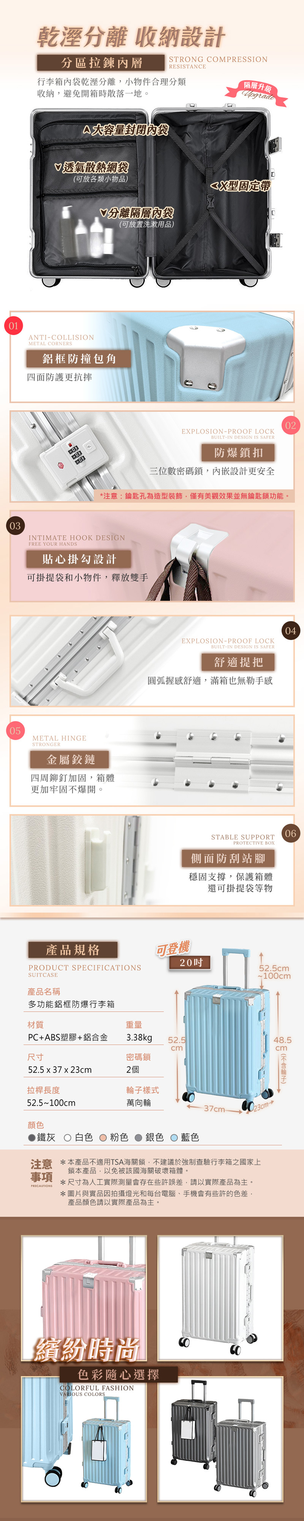FJ KA20多功能鋁框防爆行李箱 粉色