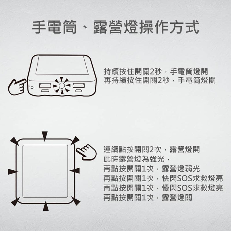 內建露營燈/手電筒 野營/登山/戶外,簡單明瞭,小巧超薄,攜帶方便,從此充電不求人