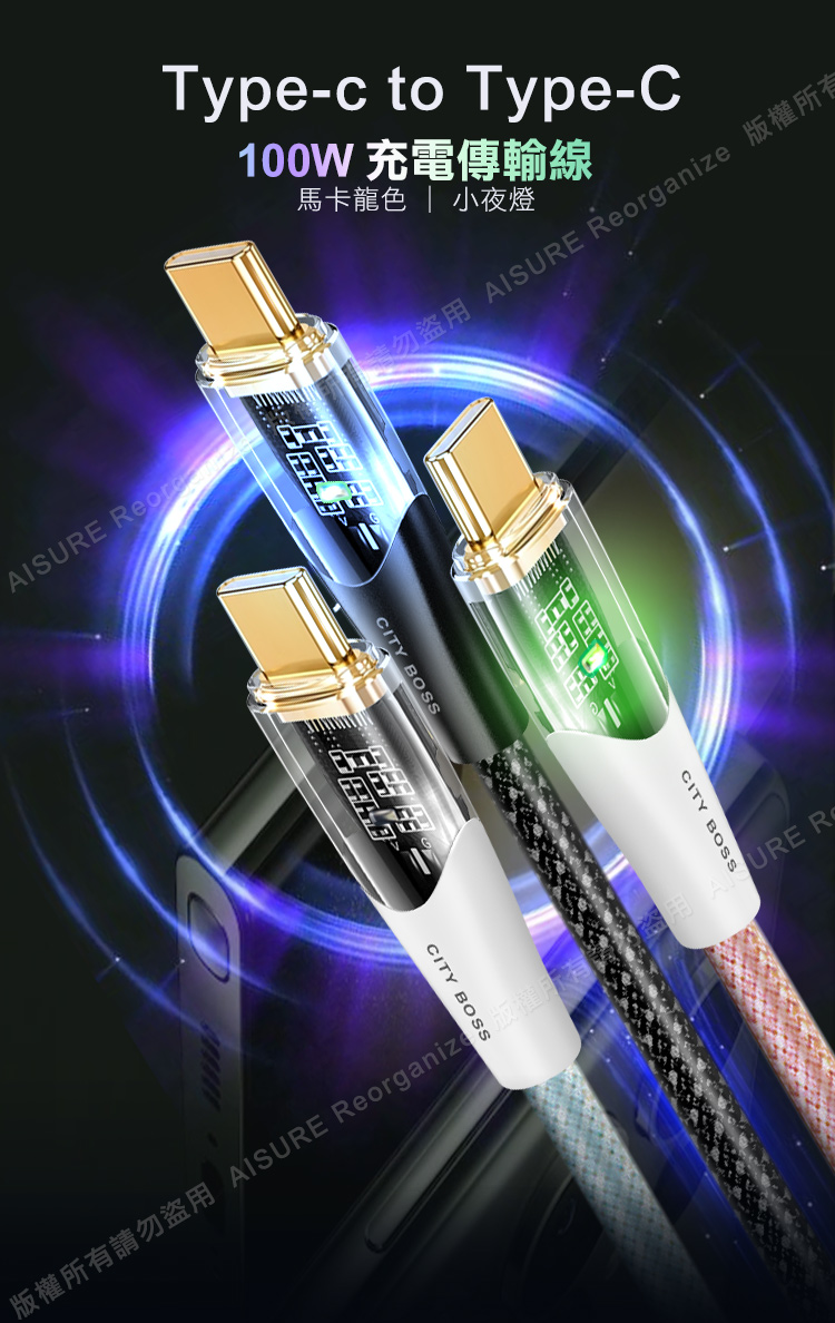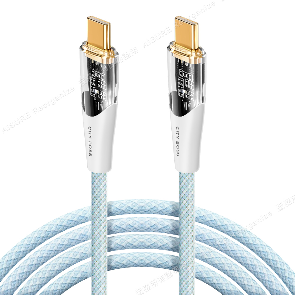 CITY BOSS馬卡龍 Type-C to Type-C 100W小夜燈充電傳輸線-300cm - 藍色
