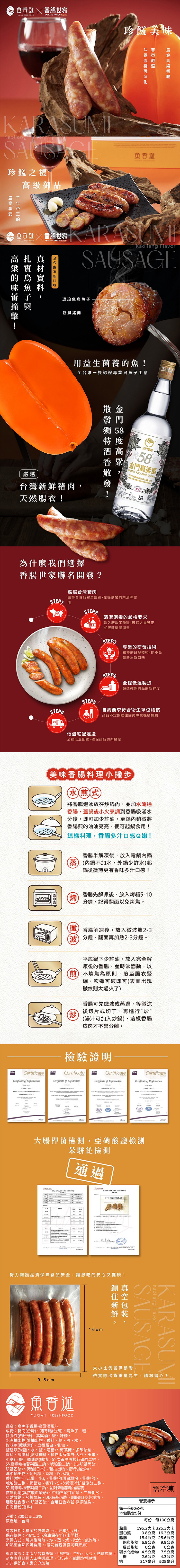 成份:豬肉(台灣)、豬背脂(台灣)、烏魚子、糖、豬腸衣(西班牙)、高粱酒、鹽、味精、水產抽出物[蟹抽出物、香料、糖、鹽、水、甜味劑(蔗糖素)]、血漿蛋白、乳糖、鹽麴液(米麴、水、鹽、酒精)、海藻糖、多磷酸鈉、香料、調味料[麥芽糊精、植物水解蛋白(大豆、玉米、小麥)、鹽、調味劑(味精、5'-次黃嘌呤核苷磷酸二鈉、5'-鳥嘌呤核苷磷酸二鈉、琥珀酸二鈉、DL-胺基丙酸、胺基乙酸)、豬油(日本)、豬抽出物、酵母抽出物、洋蔥抽出物、葡萄糖、香料、D-木糖]、香料(香料、乙醇、水)、蕃薯粉(漂白澱粉、蕃薯粉)、琥珀酸二鈉、葡萄糖、香料、5'-次黃嘌呤核苷磷酸二鈉、5'-鳥嘌呤核苷磷酸二鈉、甜味劑(醋磺內酯鉀)、抗氧化劑(異抗壞血酸鈉)、中鏈三酸甘油酯、二氧化矽、亞硝酸鈉、菸鹼醯胺、DL-胺基丙酸、胭脂紅(麥芽糊精、胭脂紅色素)、胺基乙酸、食用紅色六號、檸檬酸鈉、白肉精粉(香料)