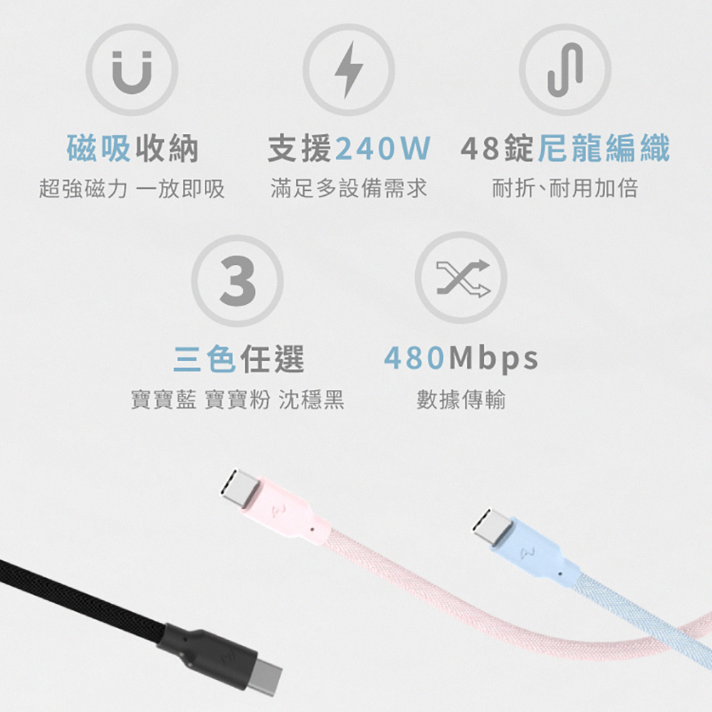 【Allite】EASY CABLE 磁吸收納編織快充線USB-C to USB-C 240W 1M-沉穩黑