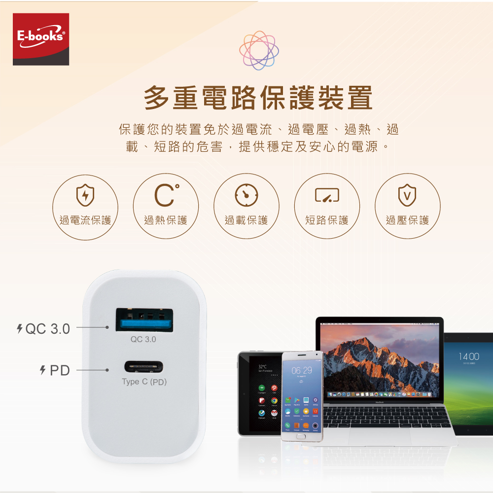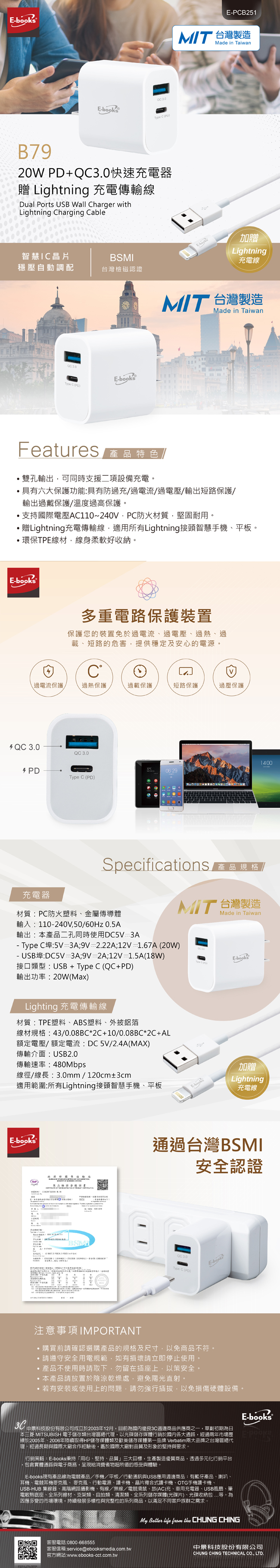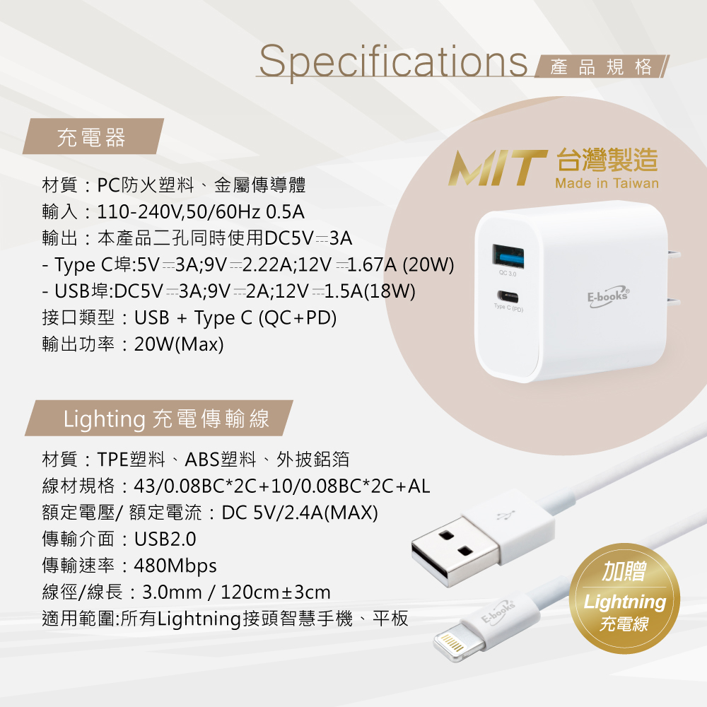 【台灣製造】E-books B79 20W PD+QC3.0快速充電器贈 Lightning 充電傳輸線1.2M