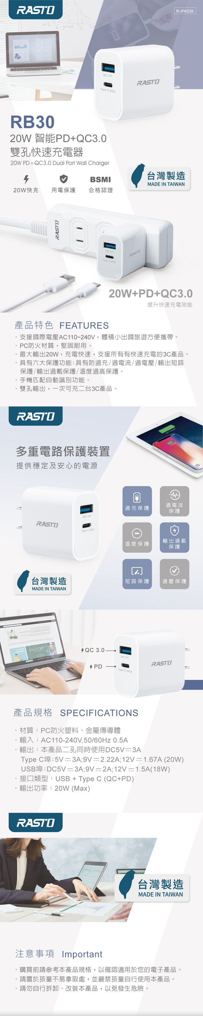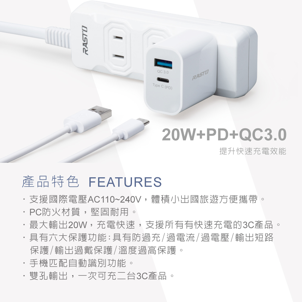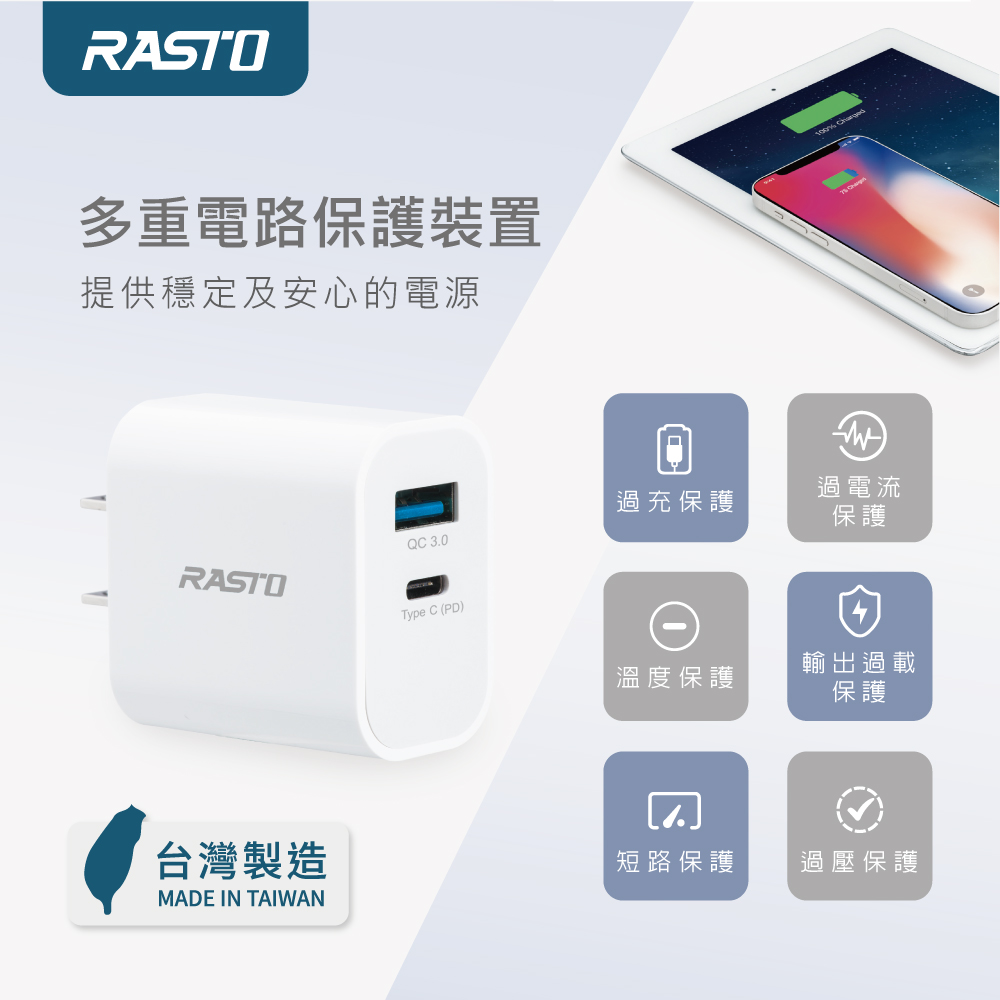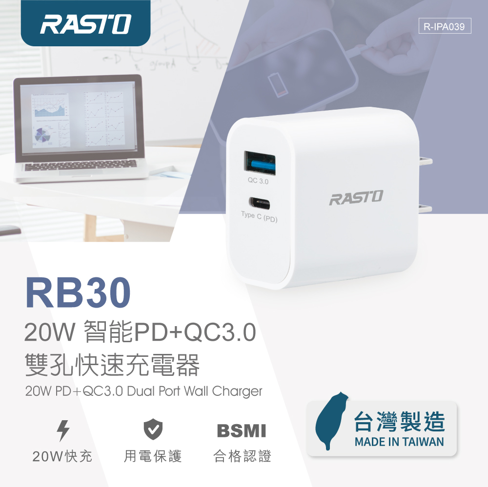 RASTO RB30 20W 智能PD+QC3.0雙孔快速充電器