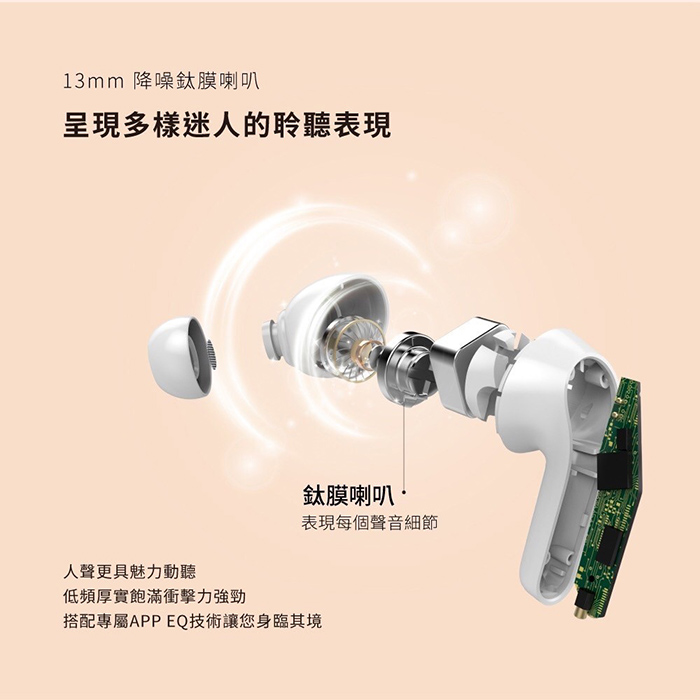 ◎ 震撼音質如臨其境|13mm降噪鈦膜喇叭,音質優於傳統真銅環和復合膜喇叭,讓您身臨其境。