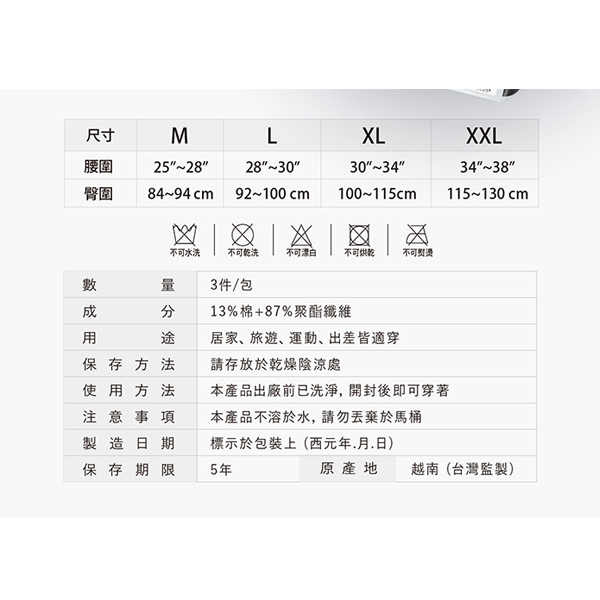 蓓比適風神紳士四角平口免洗褲 3件入(深色) XXL *6袋
