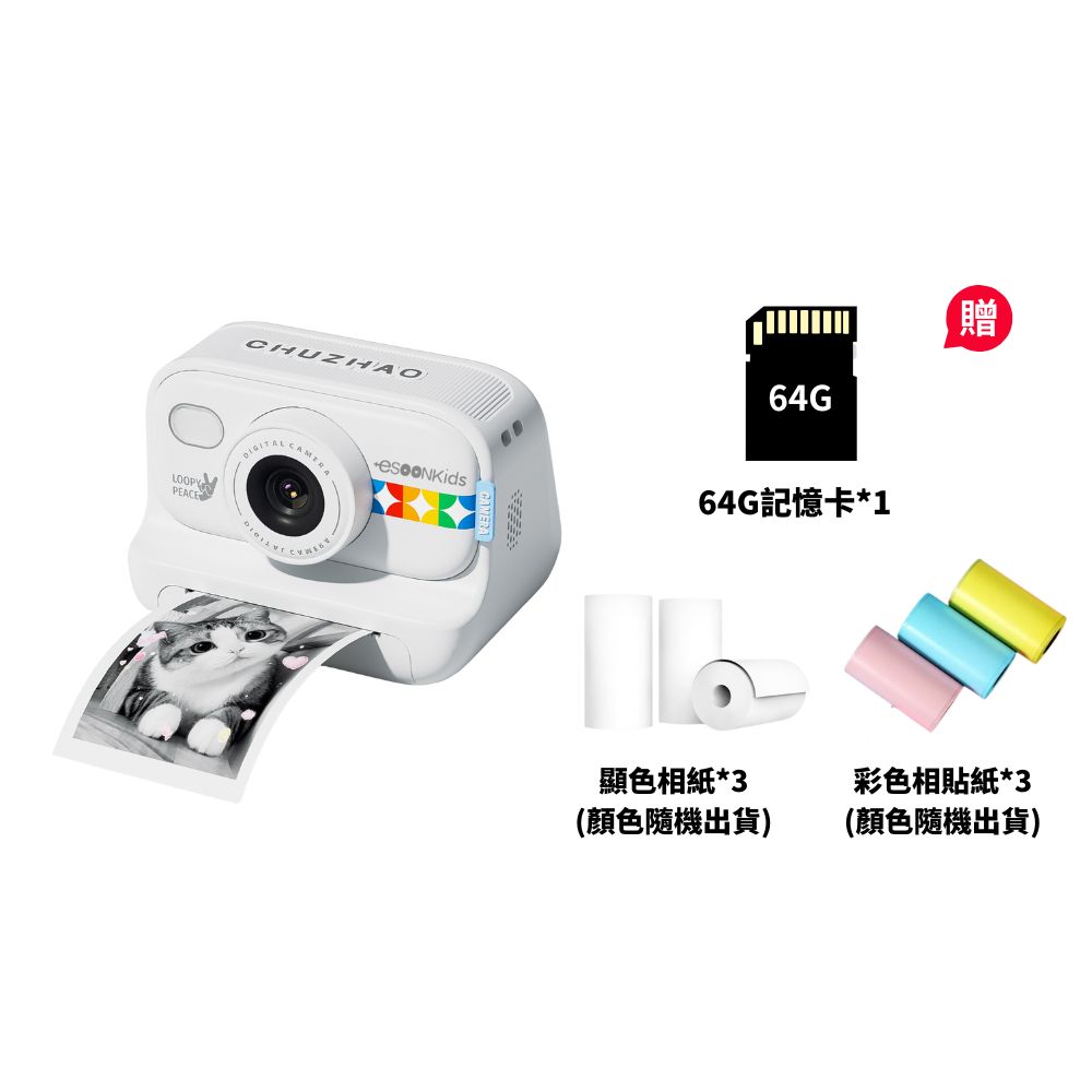 esoon esoonKids 潮玩拍立得 兒童相機 打印相機 商檢合格 最新升級款 一年保固 - 雲朵白【贈64G記憶卡+三卷相紙+三捲彩色相貼紙】