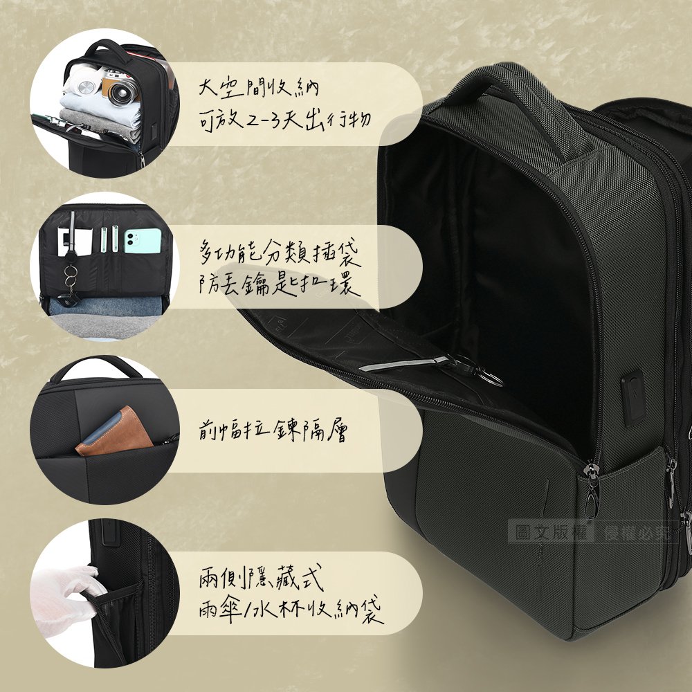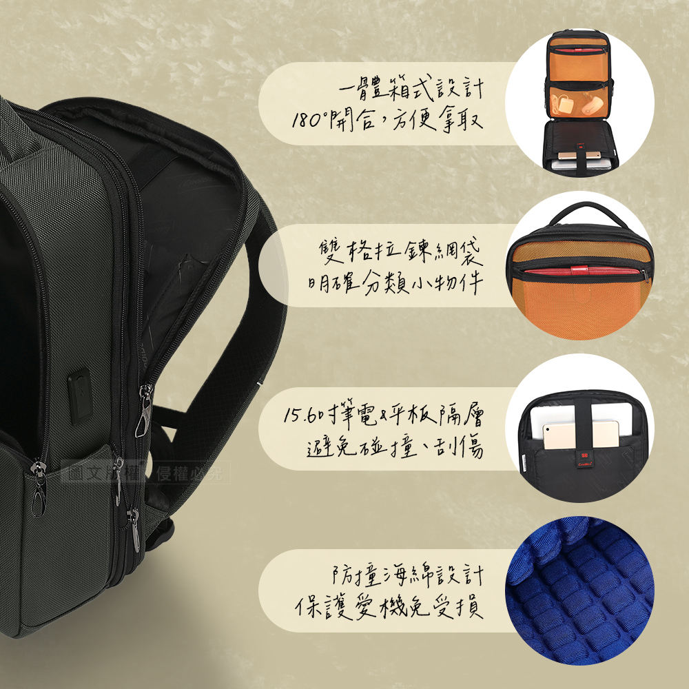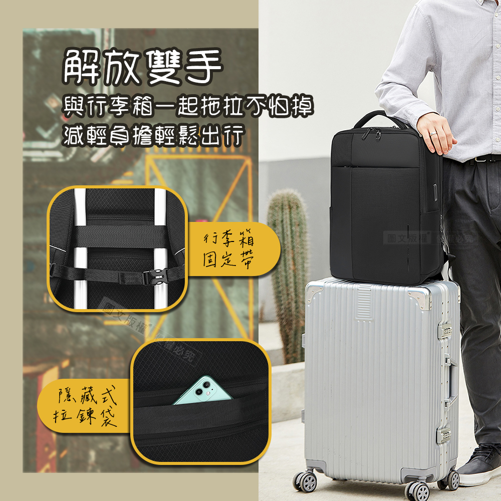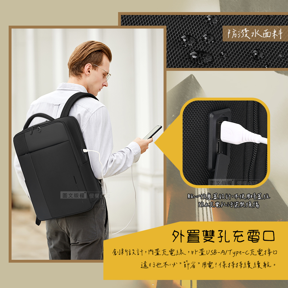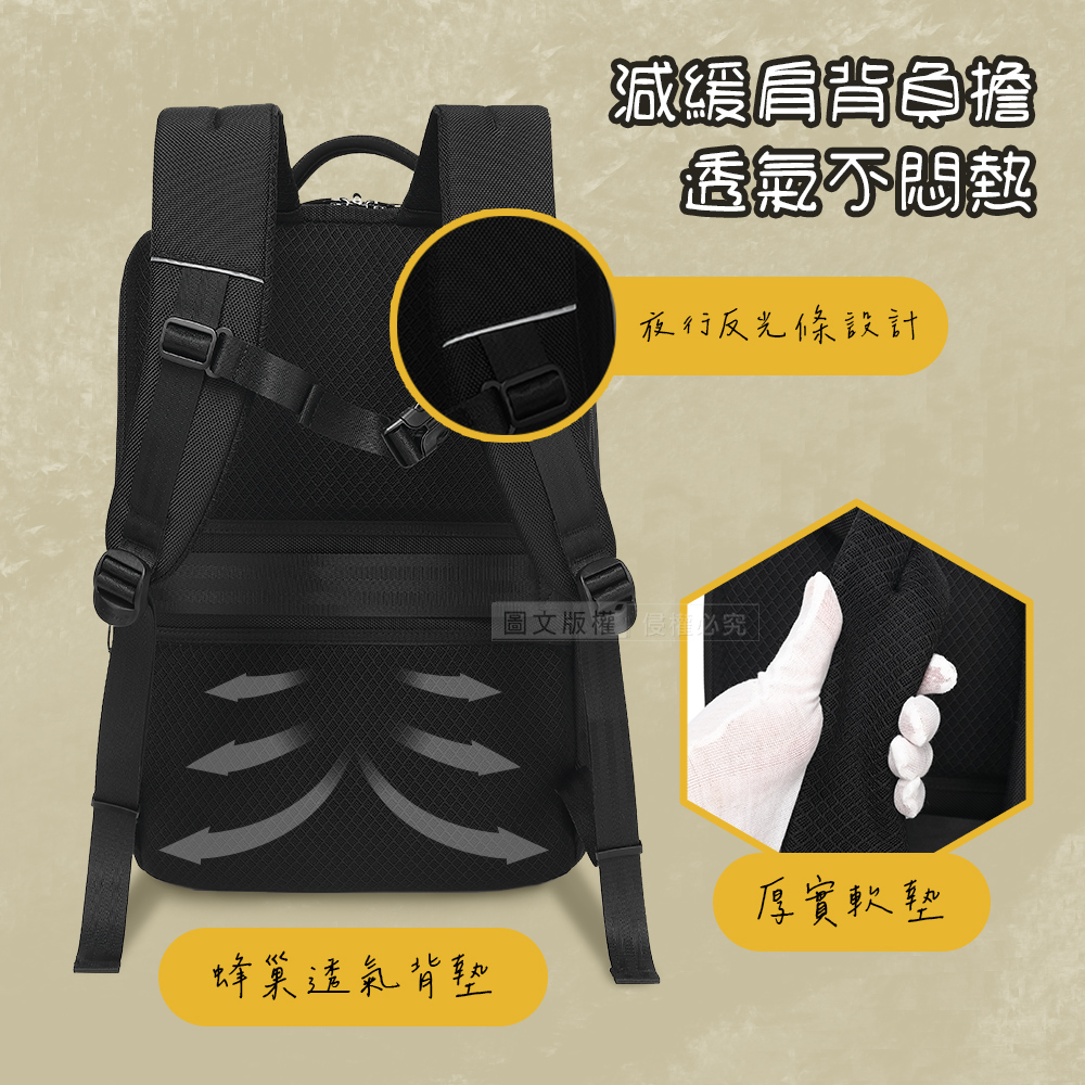 15.6吋 沉穩方格 空間擴充行李包 防撞層+蜂巢背墊 USB-A/C筆電書包後背包(方格黑)