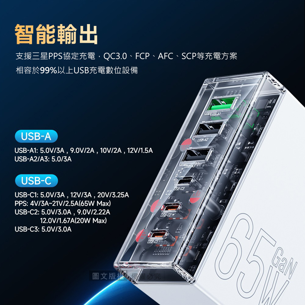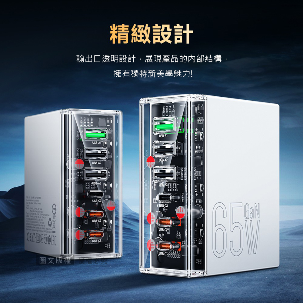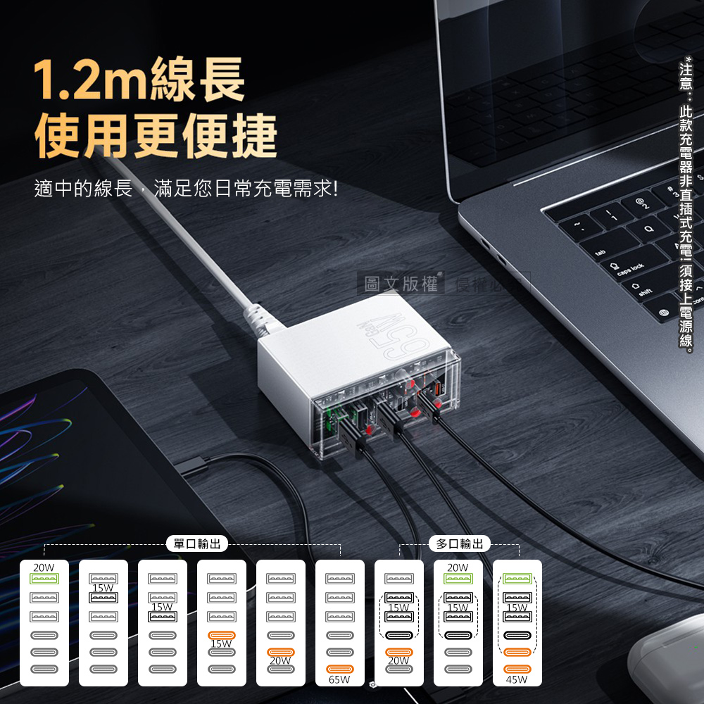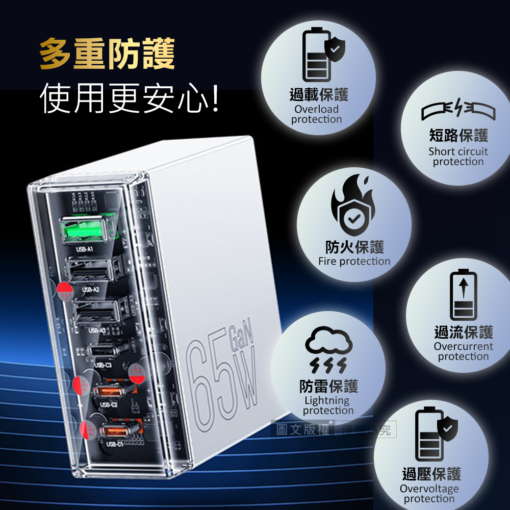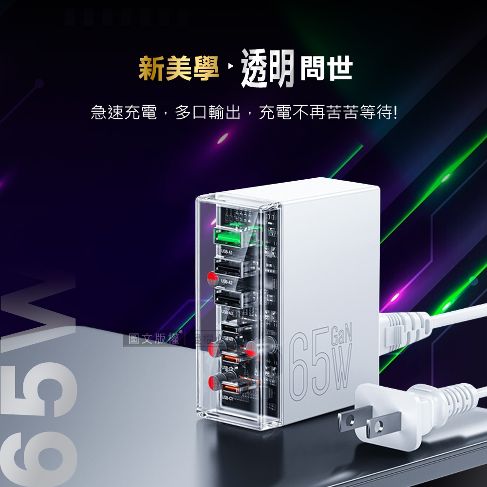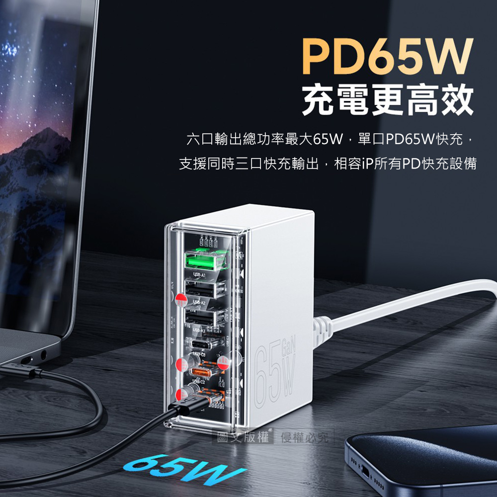 65W氮化鎵GaN 供電怪獸 PD/QC/TYPE-C 六孔輸出桌上型延長線快充充電器