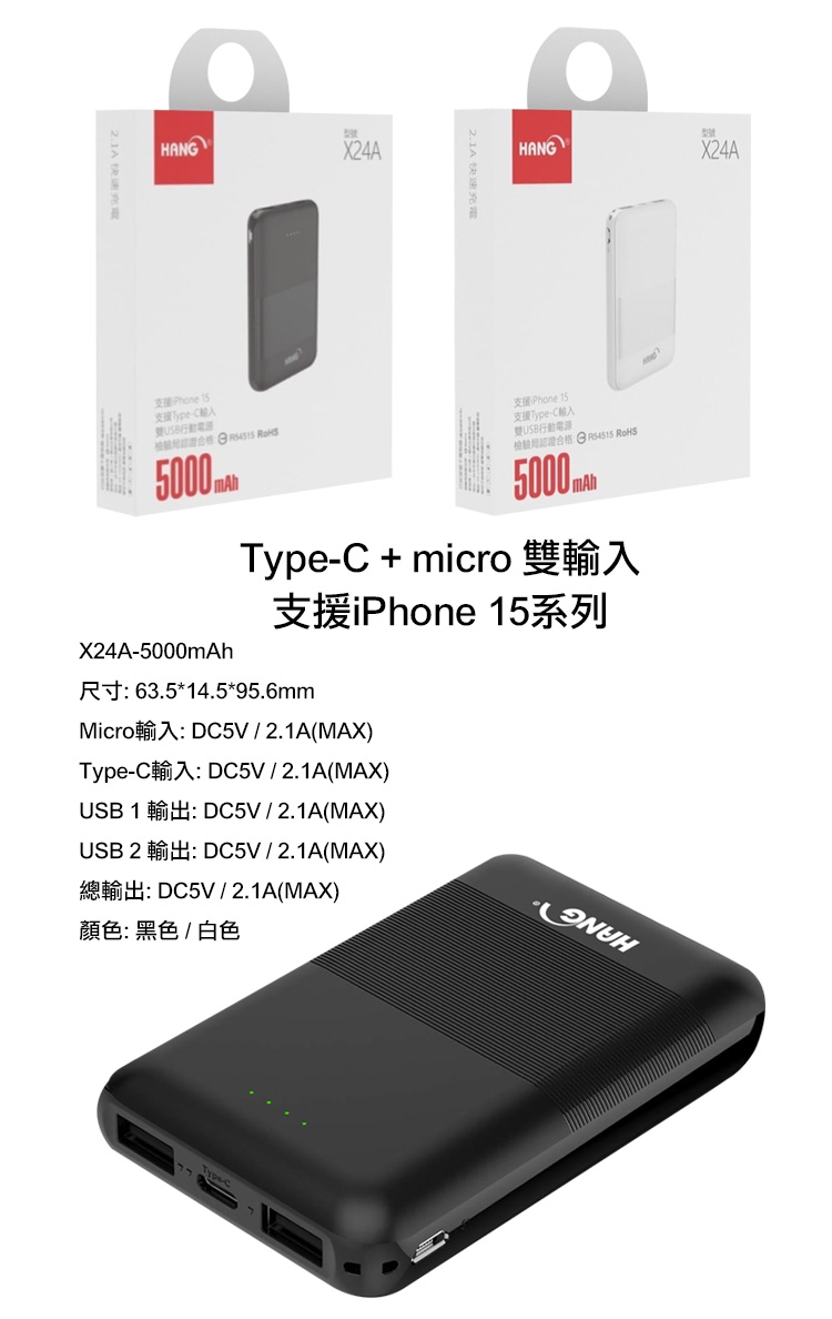 HANG X24A 迷你口袋行充 卡片型行動電源 USB雙輸出 充電寶 Type-C/Micro雙輸入-黑