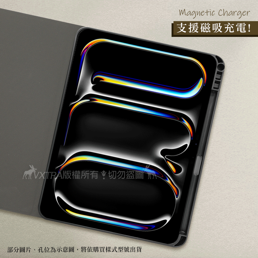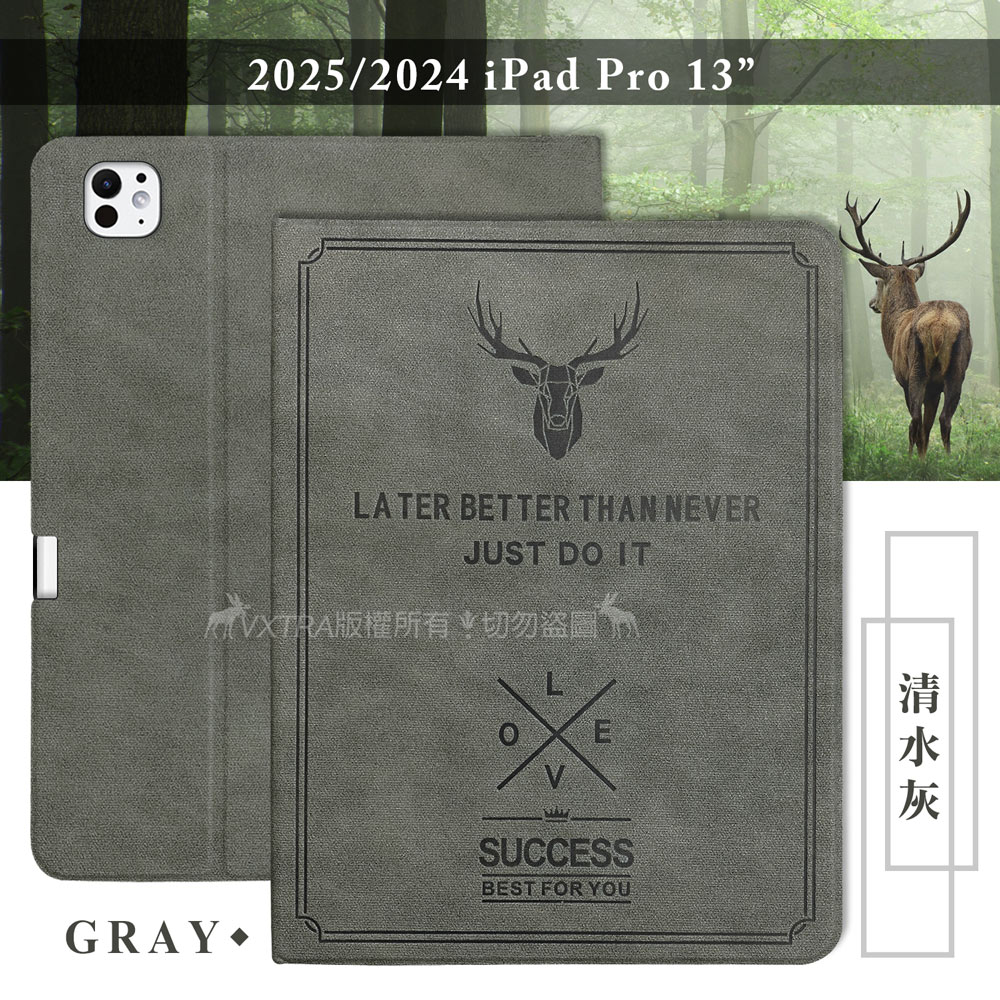 二代筆槽版 VXTRA 2025/2024 iPad Pro 13吋 北歐鹿紋平板皮套(清水灰)+9H玻璃貼(合購價)