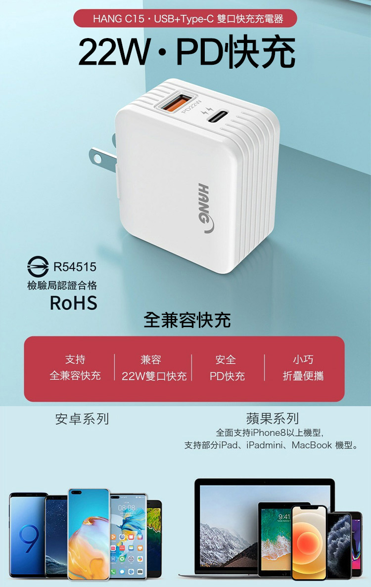 HANG 22W PD+QC 22W 蘋果三星全兼容快充閃充 雙孔旅充頭(USB+Type-C)