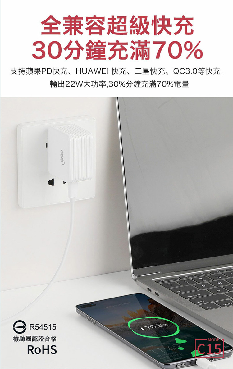 HANG 22W PD+QC 22W 蘋果三星全兼容快充閃充 雙孔旅充頭(USB+Type-C)