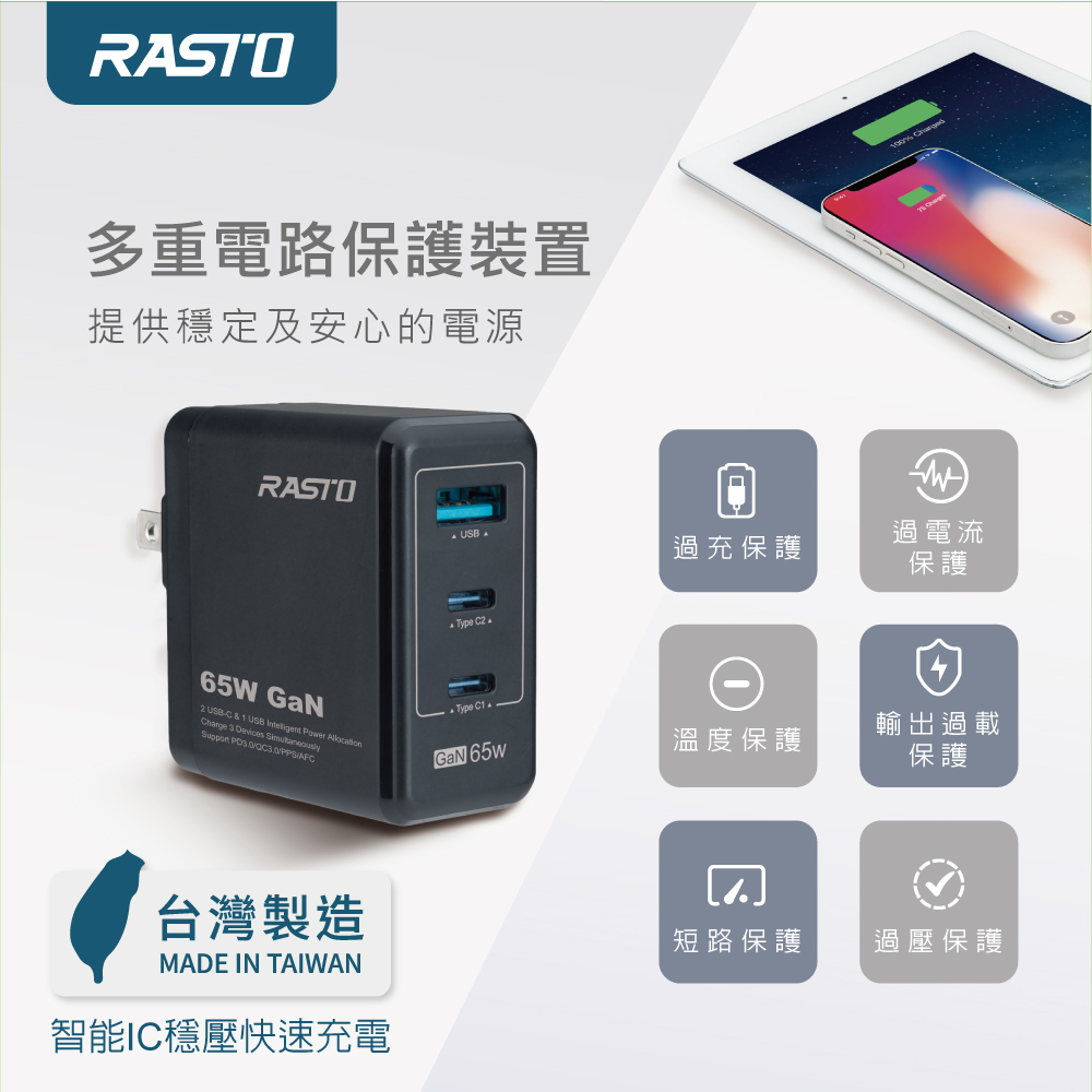 【台灣製造】RASTO RB40 65W GaN氮化鎵三孔極速充電器 + 100W C to C 鋁製快充傳輸線組