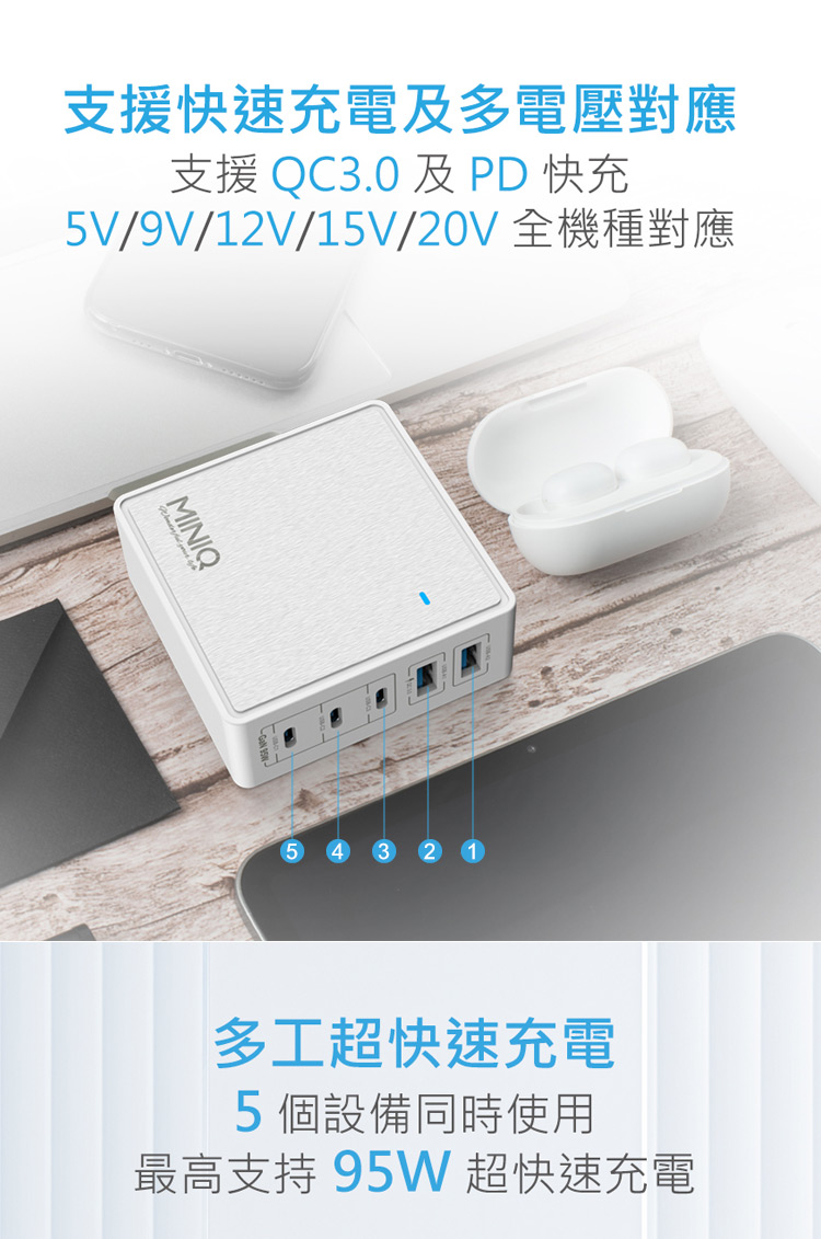 【MiniQ】AC-DK200T 五孔2A3C 95W 氮化鎵 5合1多孔排插旅充