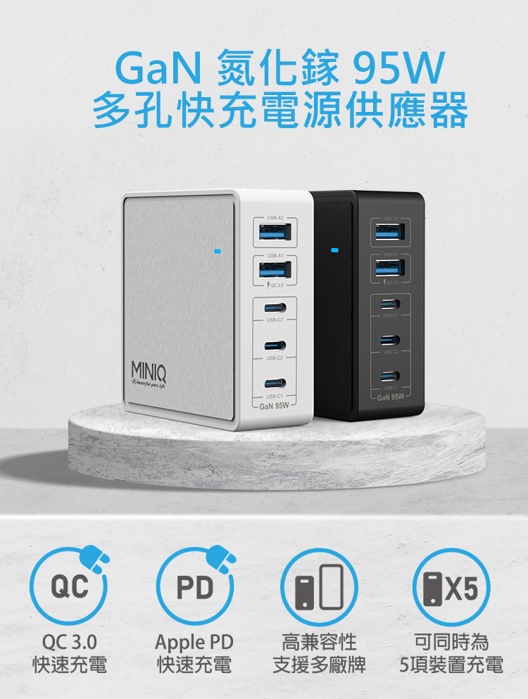 【MiniQ】AC-DK200T 五孔2A3C 95W 氮化鎵 5合1多孔排插旅充