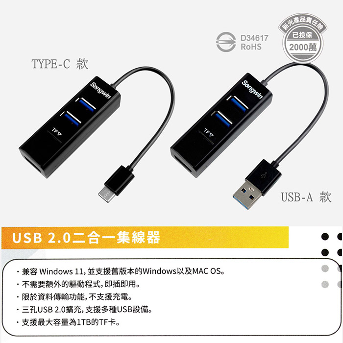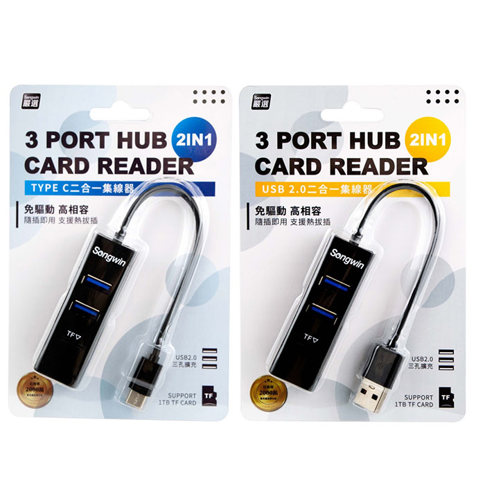 Songwin 二合一 3埠USB HUB/TF讀卡機(TYPE-A 款)