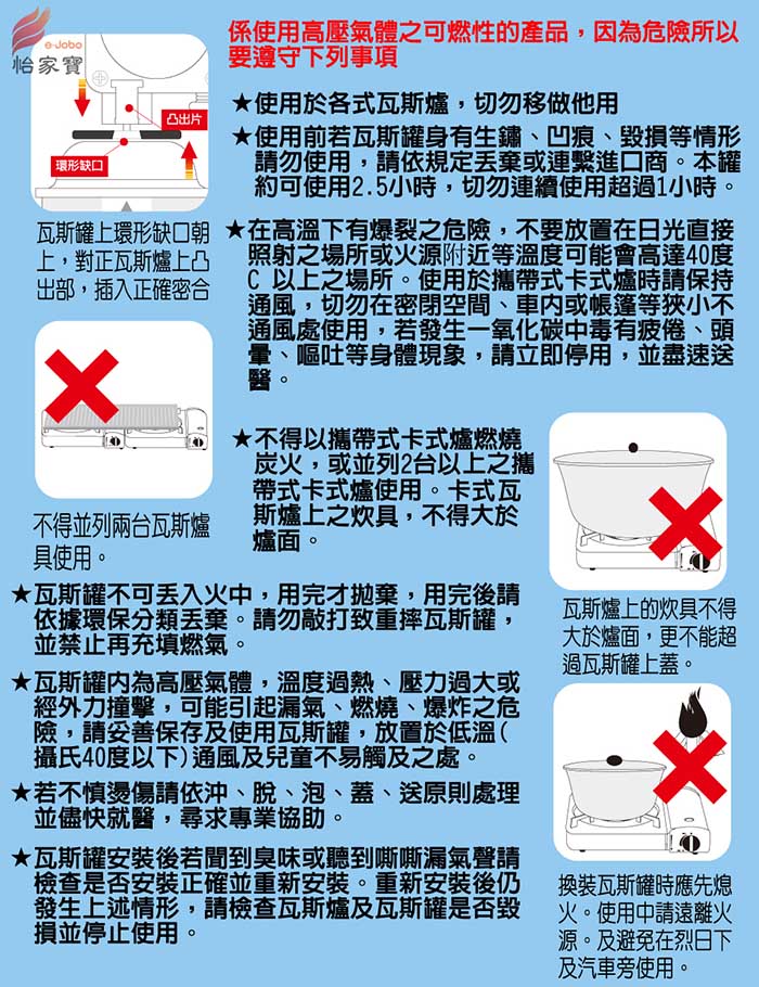 1.此產品為可燃性高壓氣體,請依照瓶身標示標準安裝。
