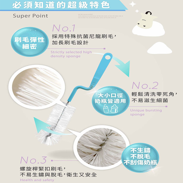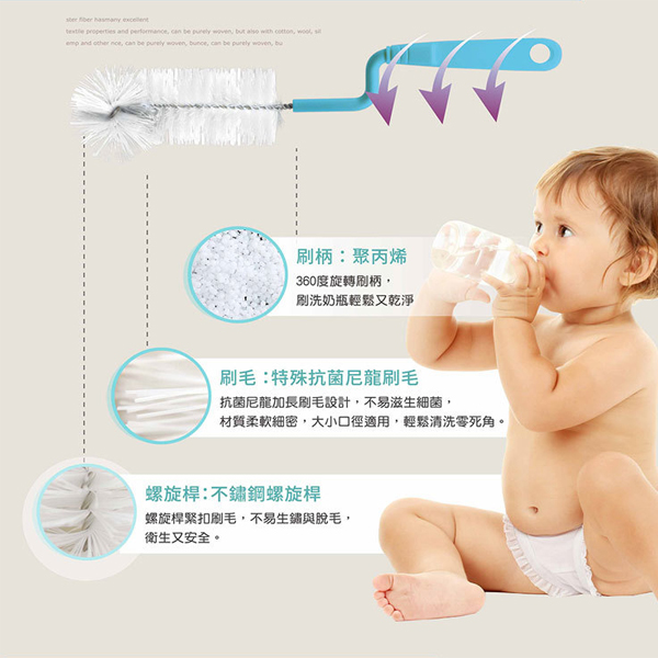 加長刷毛設計,材質柔軟細密,大小口徑適用,輕鬆清洗零死角