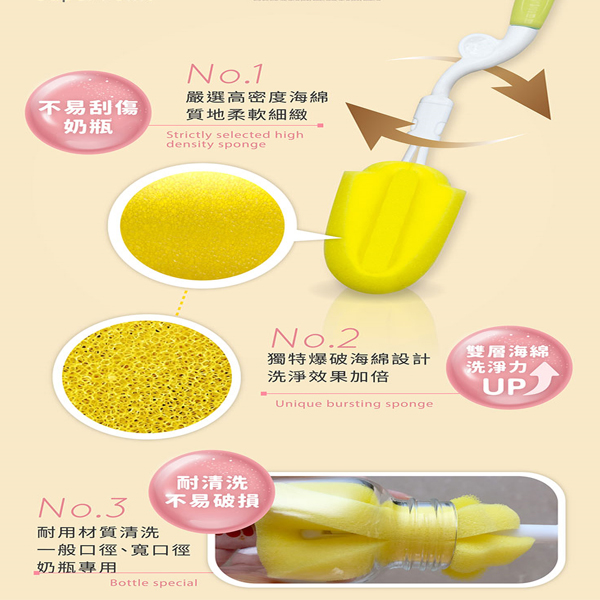 嚴選高密度海綿,質地柔軟細緻,不易刮傷奶瓶。